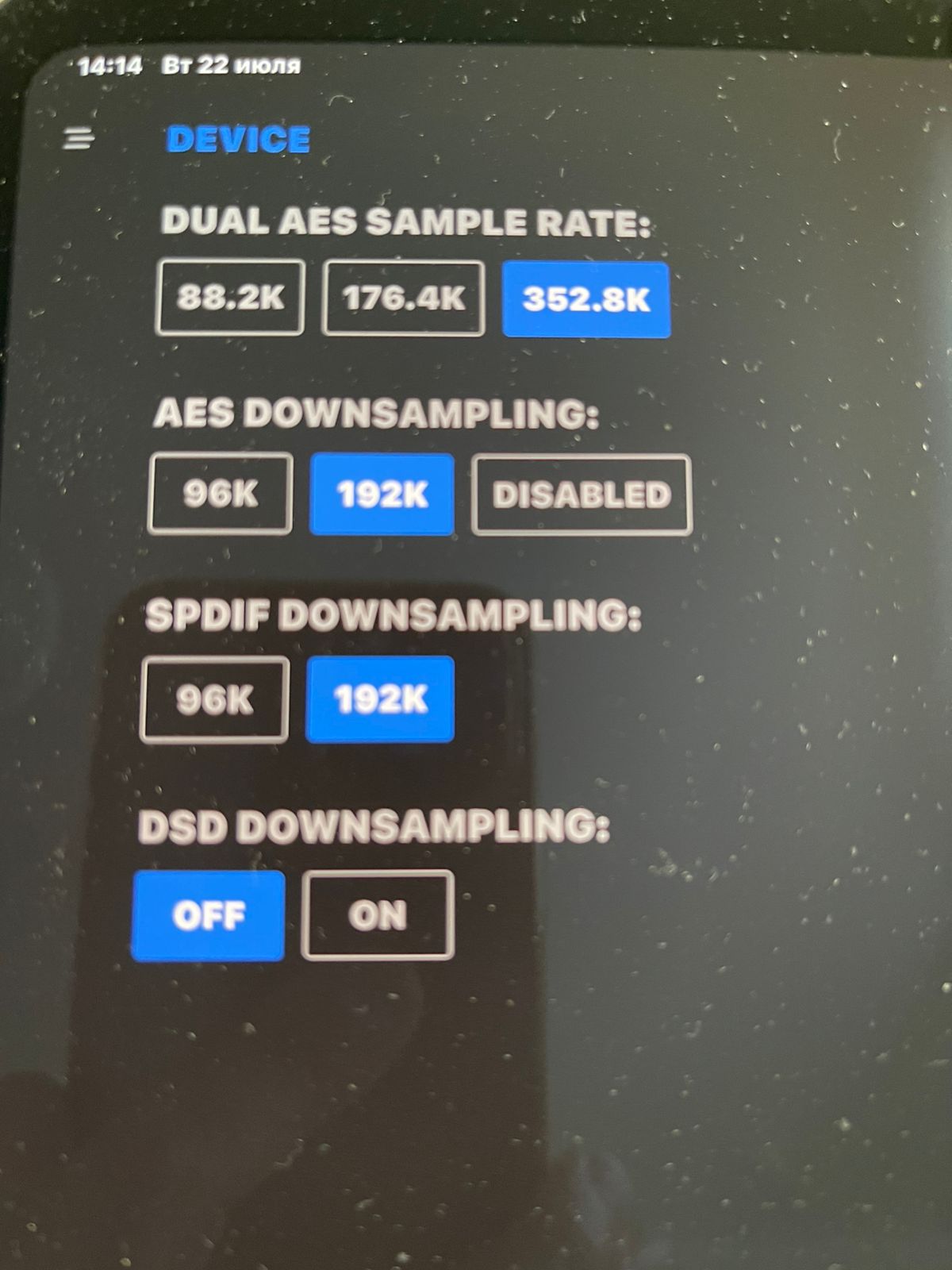 В настройках dCS в разделе Device DUAL AES SAMPLE RATE у меня стояло значение 176,4К , и очевидно при проигрывании 24/192 этого было недостаточно. Проблема решилась очень просто-выбором настроек как на фото.