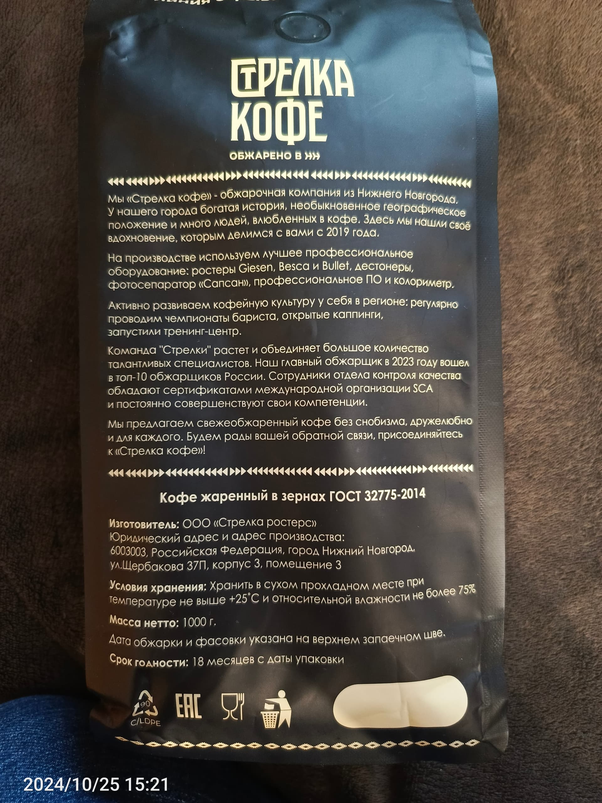 Куплен на ВБ за 1280р, обжарка 06.10.24г. На мой взгляд заметно лучше ижевского тейсти, насыщенный и плотный, кислинка присутствует умеренно, аромат выраженный.