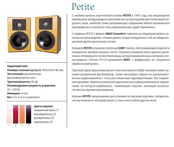 Покупались фактически вслепую - я не слышал их купольные высокочастотники и понятия не имел как это будет звучать. Не разочаровался! Будучи соседями по линейке с Petite, эти АС сочетают несочетаемое - они звучат совершенно по другому, по сравнению с Petite, и при этом, совершенно невообразимым способом не дают усомнится - это Neat.
