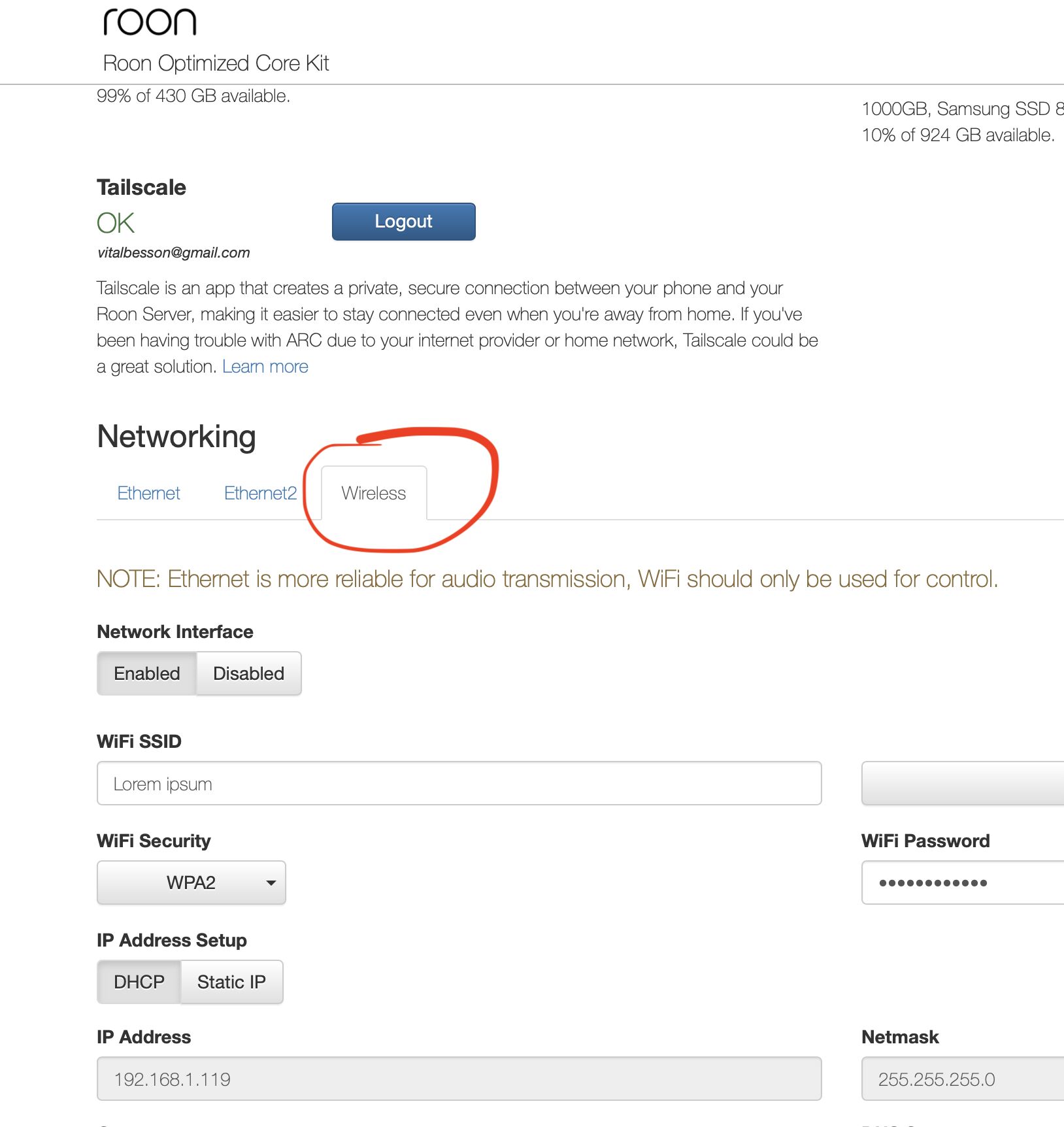 Небольшой апдейт. Несмотря на то, что Roon ROCK официально не поддерживает wireless, часть драйверов сетевых карт остается в системе, и некоторое железо с ним вполне себе совместимо. В этом случае появляется еще одна вкладка в морде. И если вдруг комп как-то так стоит, что проводом не придешь, может быть полезно.