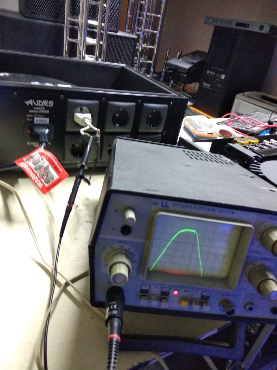 Желтая линия это входная сеть , синяя линия это вторичная выходная обмотка трансформатора, форма и амплитуда помехи совпадает полностью. Из чего мы делаем вывод, что фильтрующие свойства у AUDES 3000 отсутствуют как таковые.