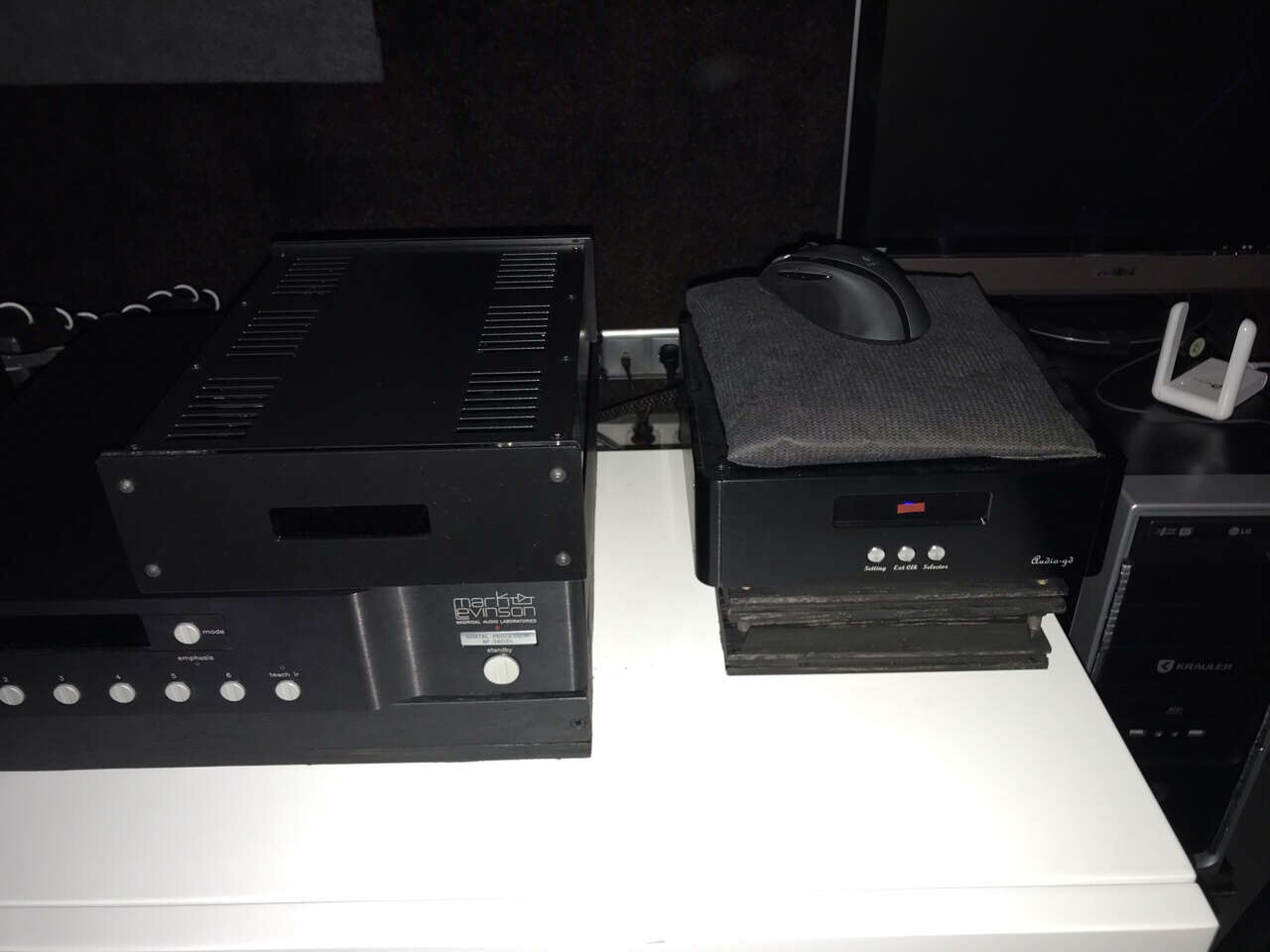 Поэтому Bolero отправился в систему с наушниками у рабочего iMac, куда кроме него входит Weiss INT203, в данный момент без ЛБП, получающий питание по шине FireWire, кабель FW простенький, комплектный от Apogee Duet FireWire, Weiss по AES/EBU-кабелю Craft DX подключён к Benchmark DAC1, который работает на Sennheiser HD600, у Luxman P-1 снова отобран понижающий РТ, поэтому он простаивает в спячке.