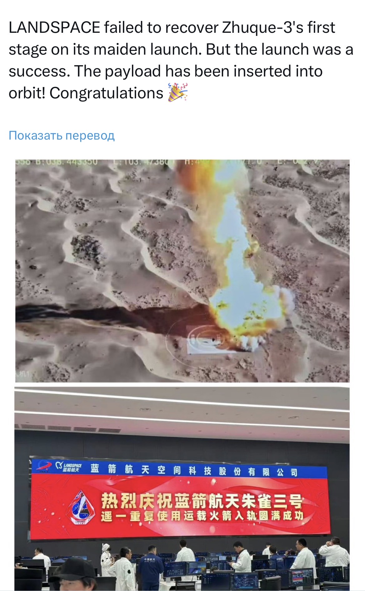 Ну что ж, вроде как старт Zhuque-3 прошел успешно, а вот про возвращение первой ступени надо ждать официальное китайское сообщение. На тех кадрах что попали в сеть видно что ускоритель куда-то возвращается (уже здорово), но траектория и скорость посадки больше похожа на падение.