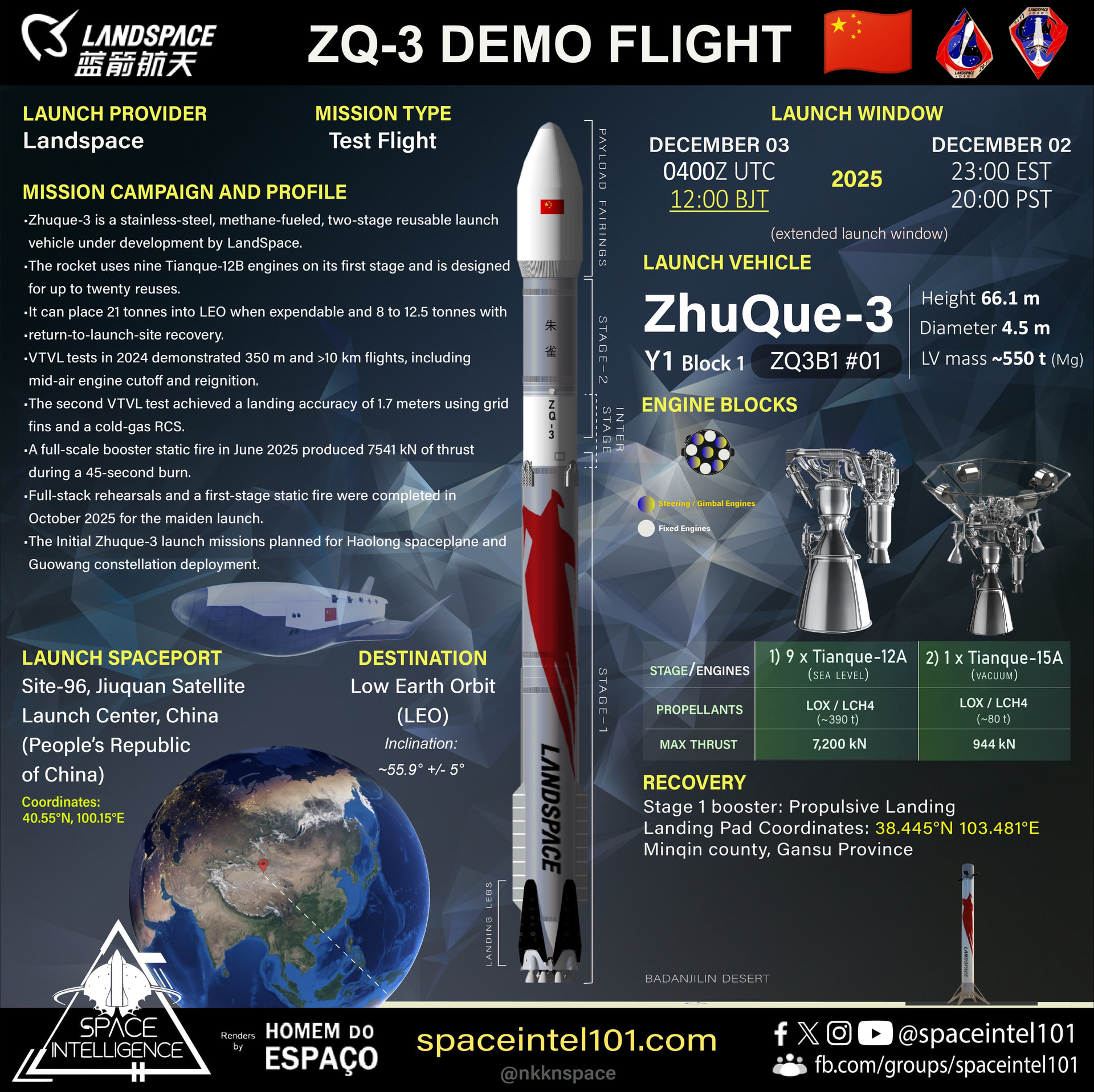 Подтвержден тестовый запуск многоразовой ракеты Zhuque-3 средне-тяжелого класса, завтра 03 декабря около UTC+8