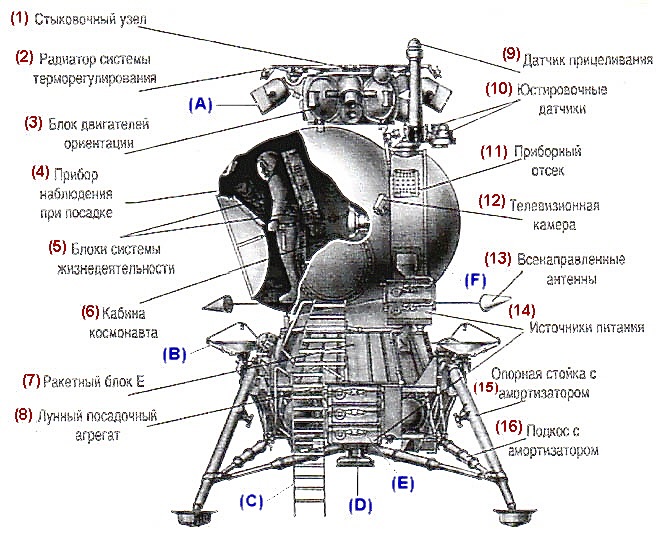 Лунный посадочный агрегат (ЛПА) — четыре ноги-опоры с сотовыми поглотителями удара (как огромные амортизаторы). Именно этот блок оставался на Луне навсегда после взлёта.
