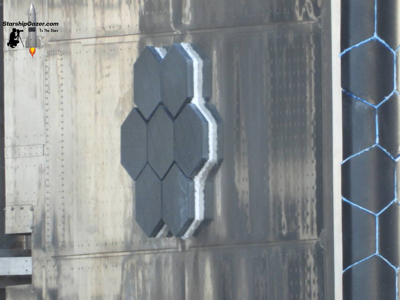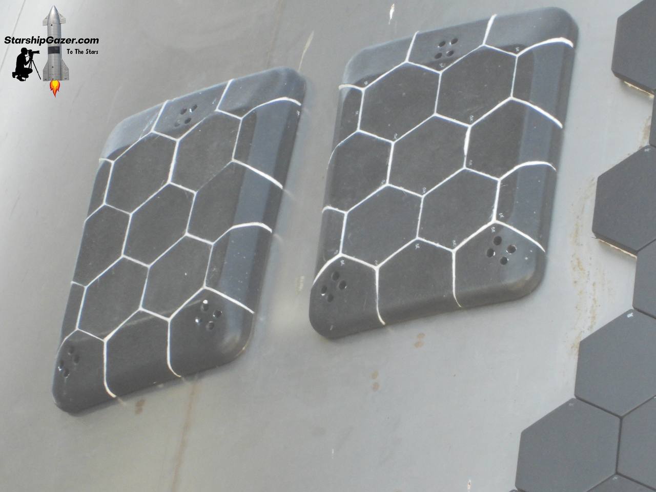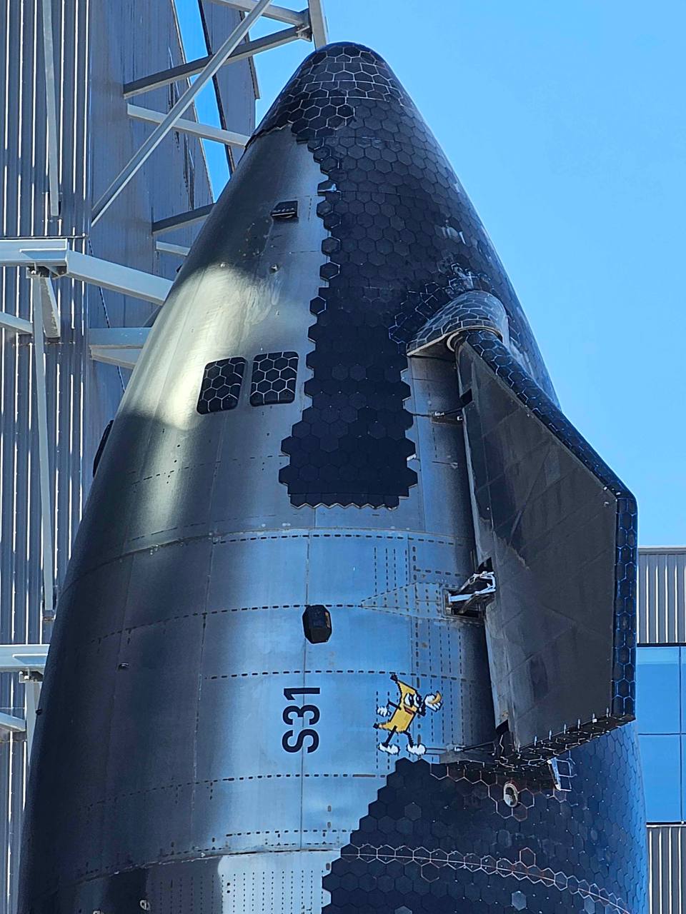 Первым делом бросается в глаза «срезанная» по бокам тепловая защита (предполагается что в этих местах в следующий раз будут установлены некие захваты чтобы и Starship ловить башней), а также дополнительные тестовые термоплитки со внутренней части нижних плавников. Видимо, будут тестировать новый клеевой состав.