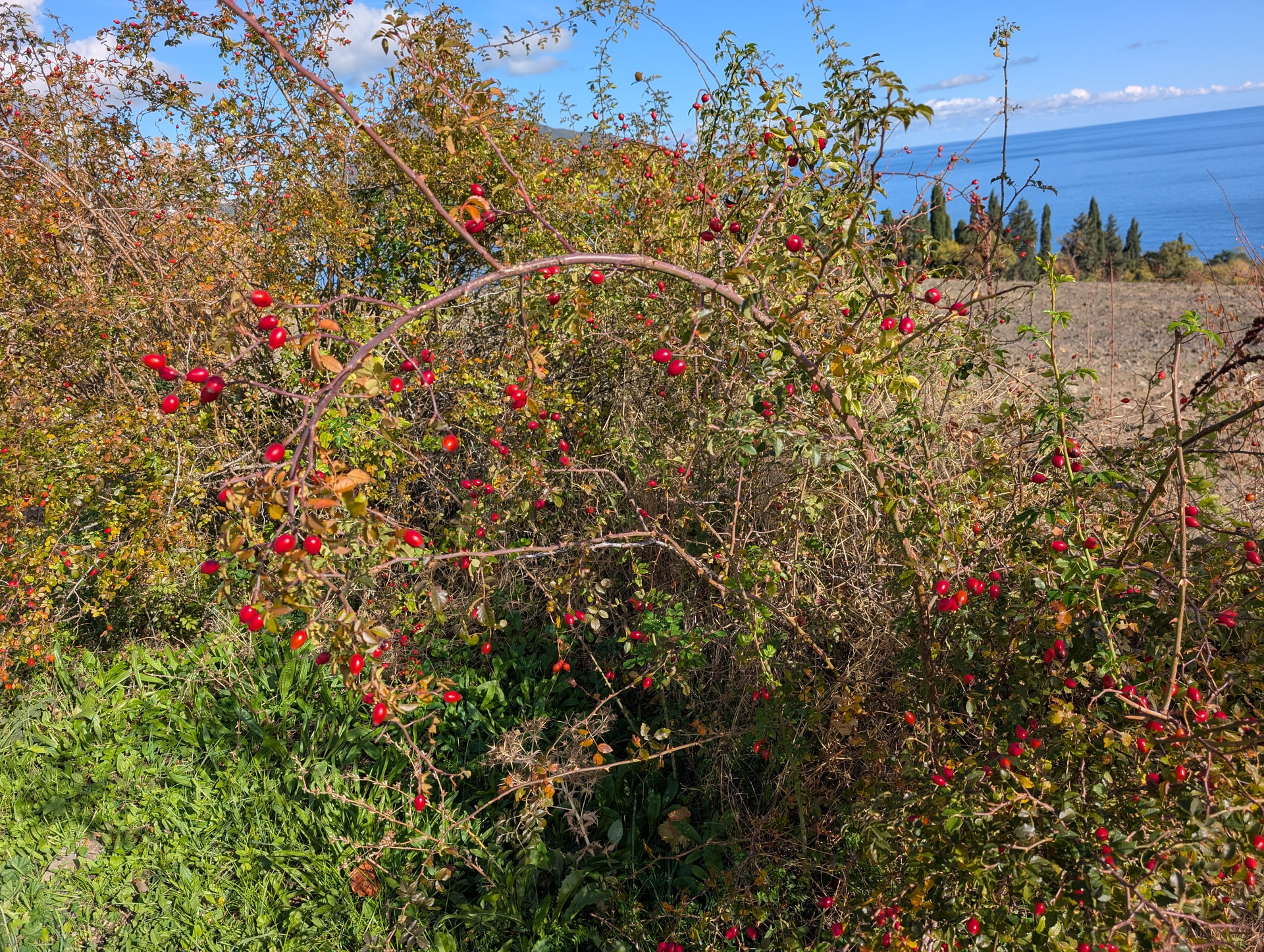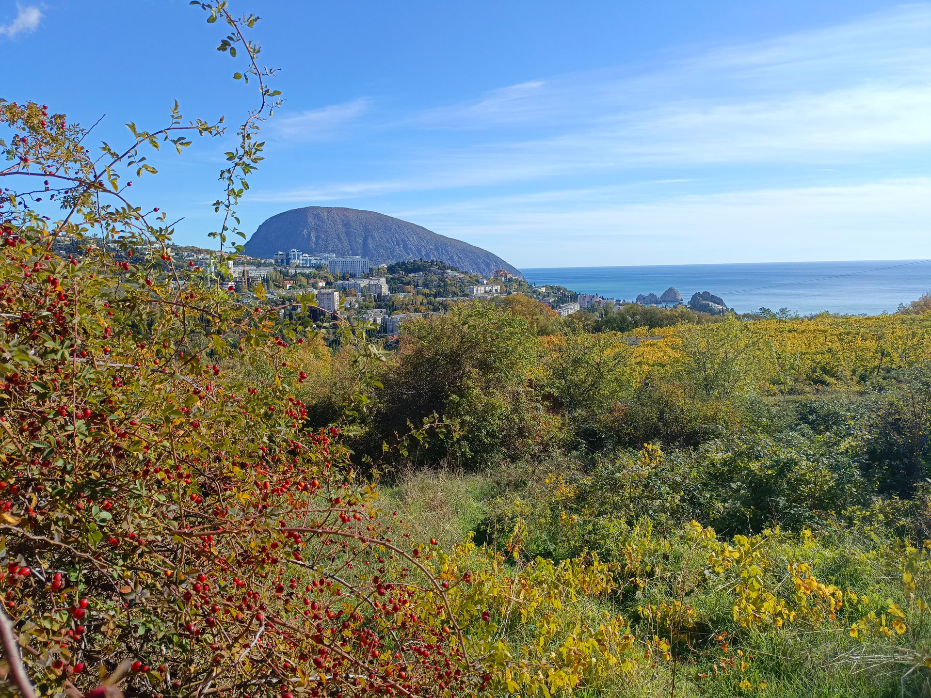 Прогулялись между Гурзуфом и АйДанилем. Ранняя осень, +19°. Выдры в озере. Шиповник, нарвали немного.