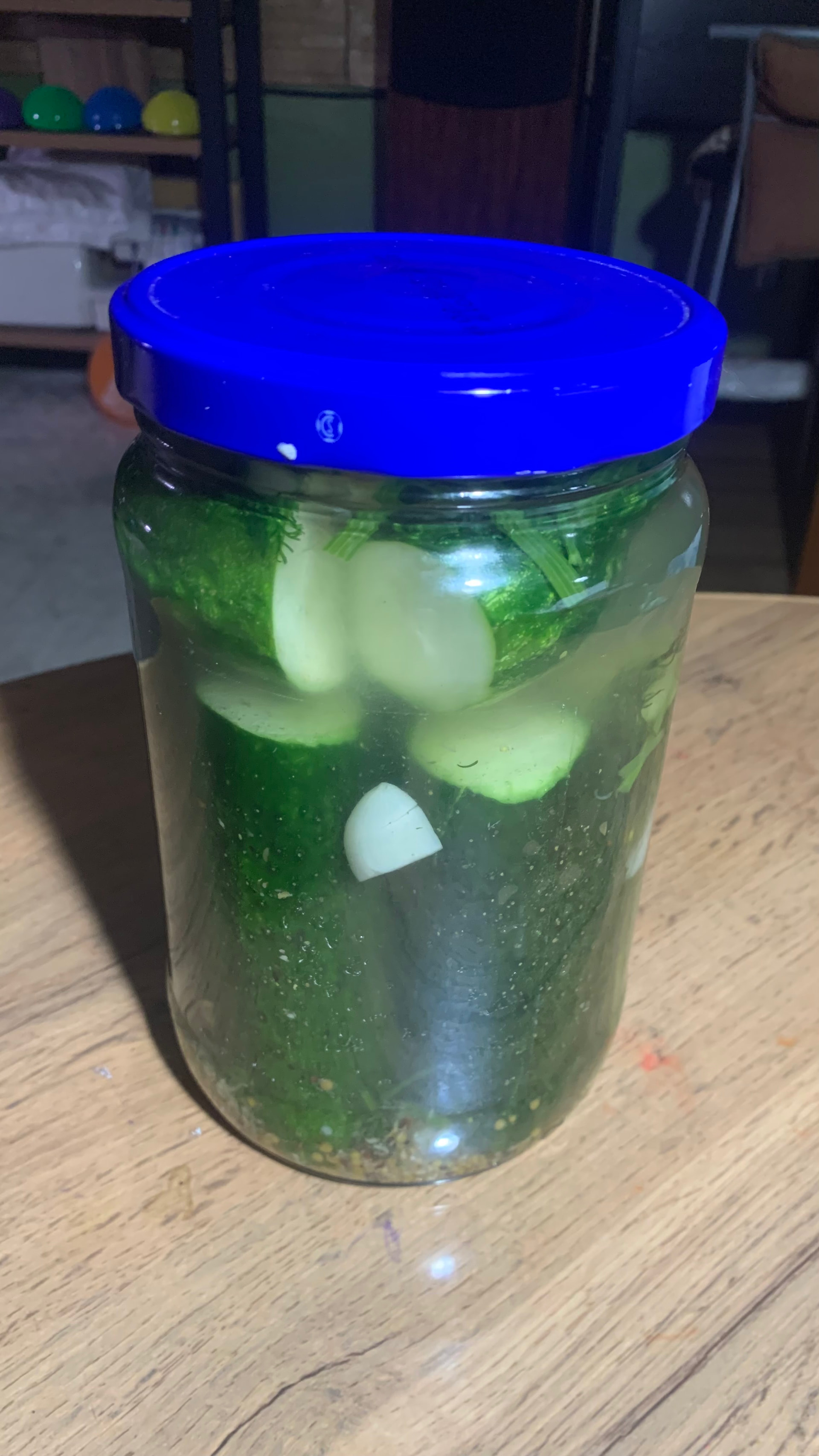 И салат из резаных огурцов с луком, кисленький А это вчерашний итог после ночи под теплым одеялом)А мы скромно, пару банков помидоров и баночку лука маринованных.