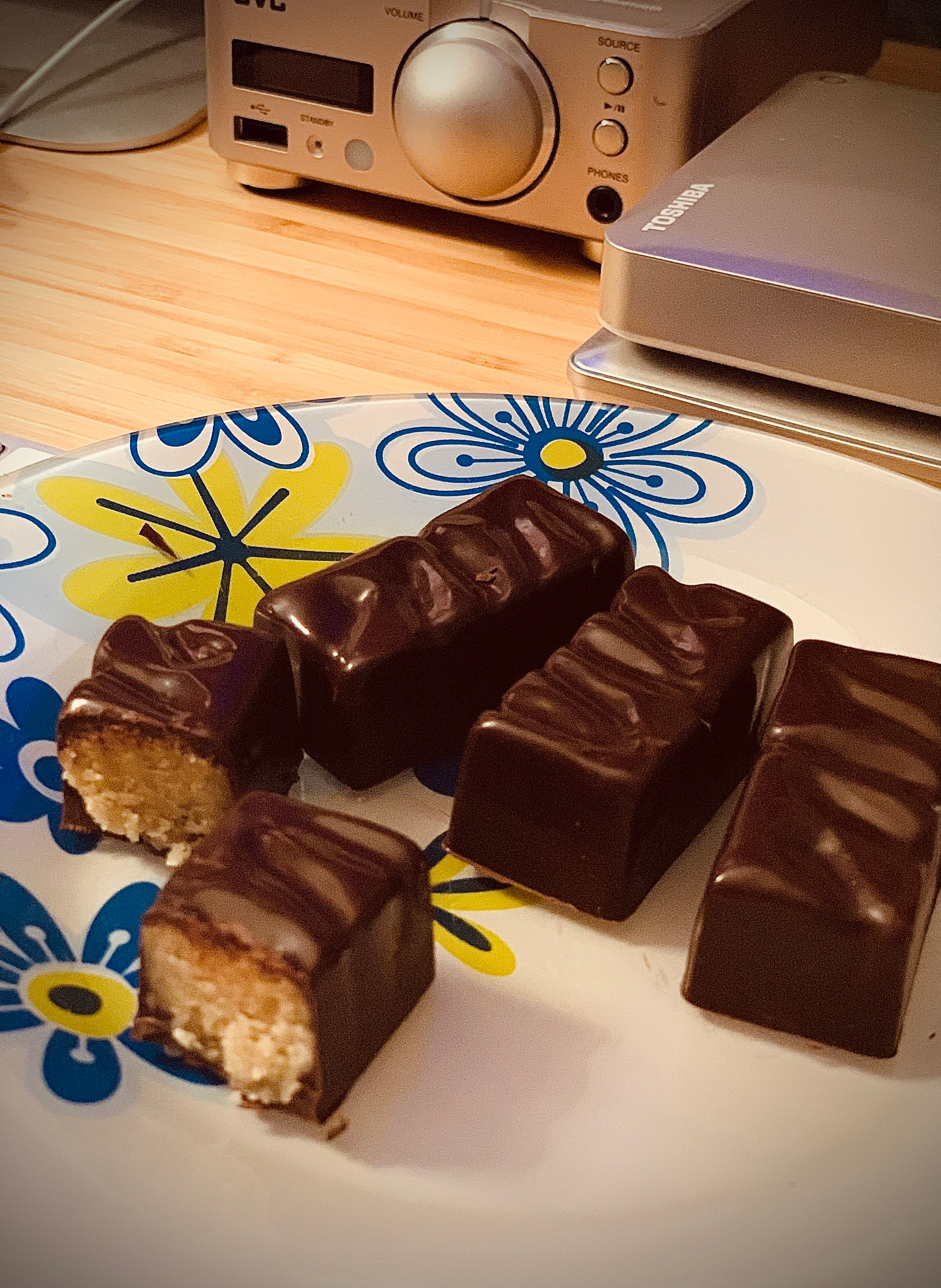 Зато, нашел початую бутылку коньяка Фрапен и сделал пирожные картошка и марципан с коньяком в шоколаде.