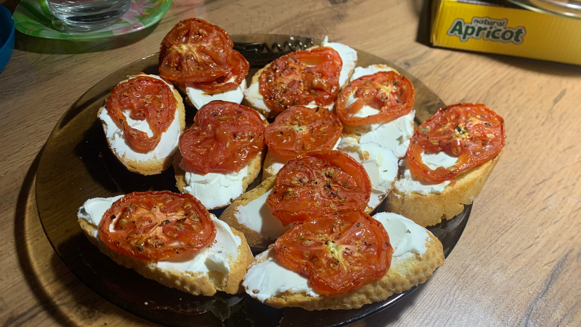 Остаток помидор подсушиваем с прованскими в духовке. Сушим батон, мажем его творожным сыром и сверху помидор остывший