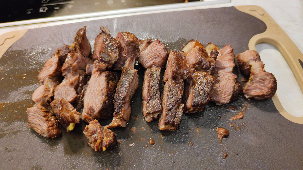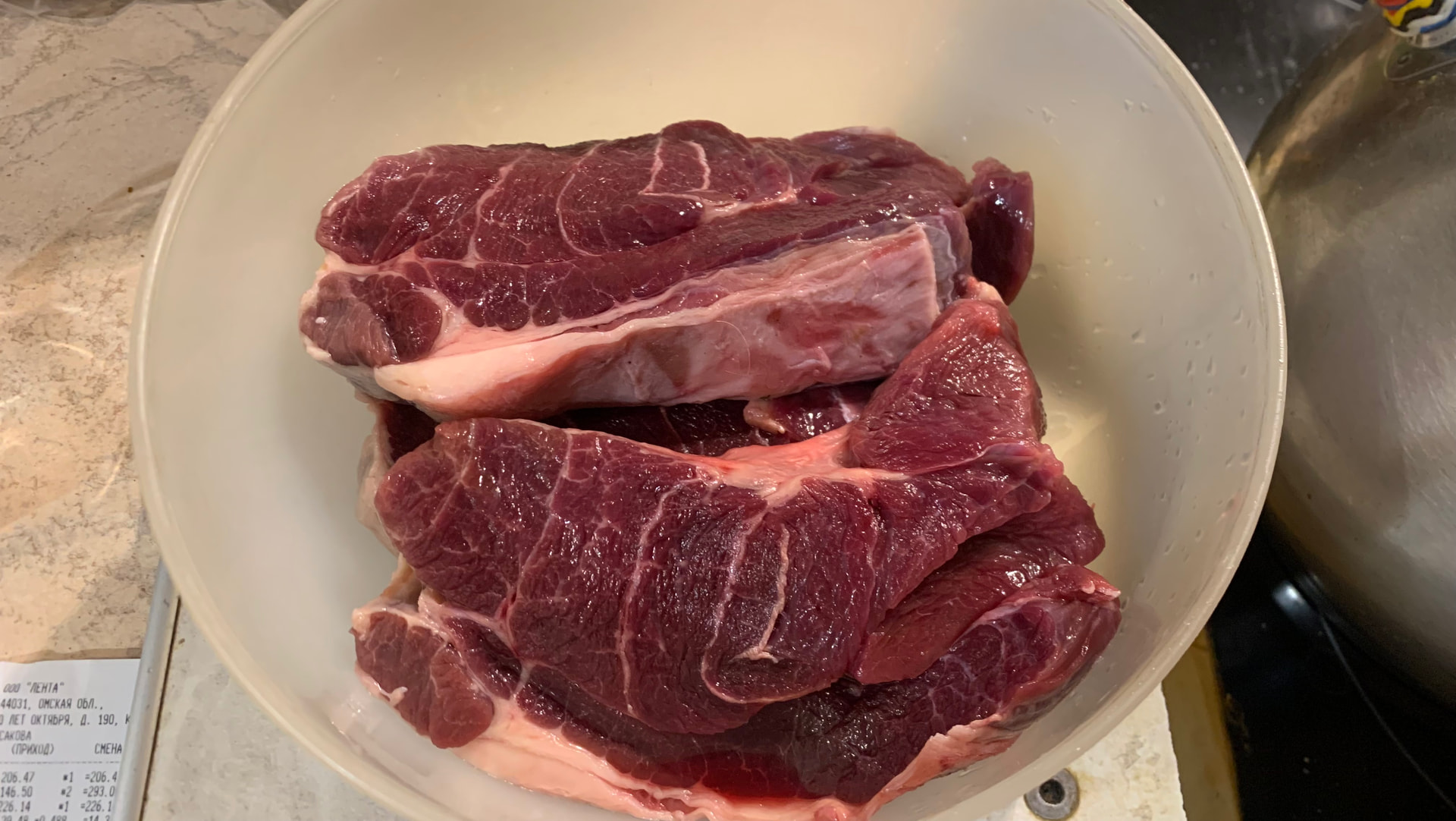 7 минут отдохнуло и нарезал. Часть тела не знаю, брал как мякоть. Жестковато, но жуется. Вкусно очень! Кот орёт и требует еще!