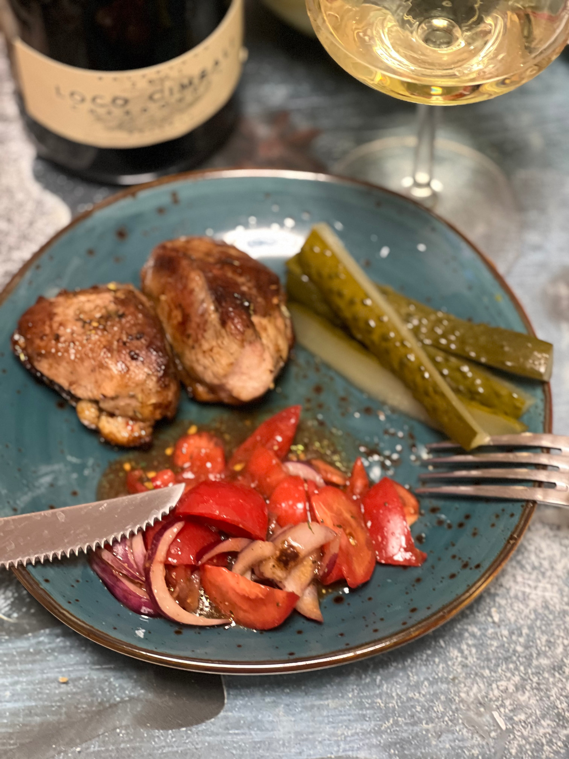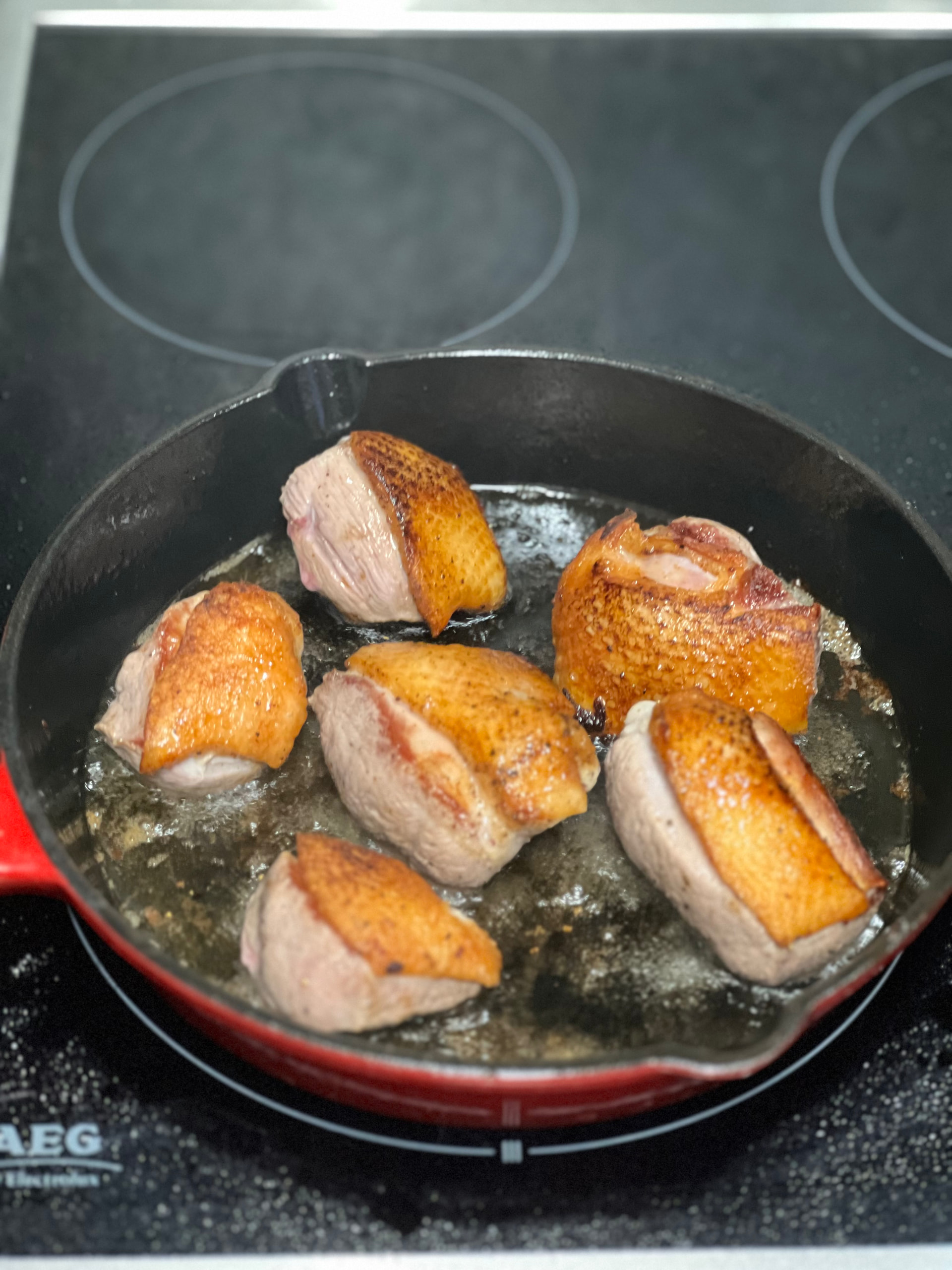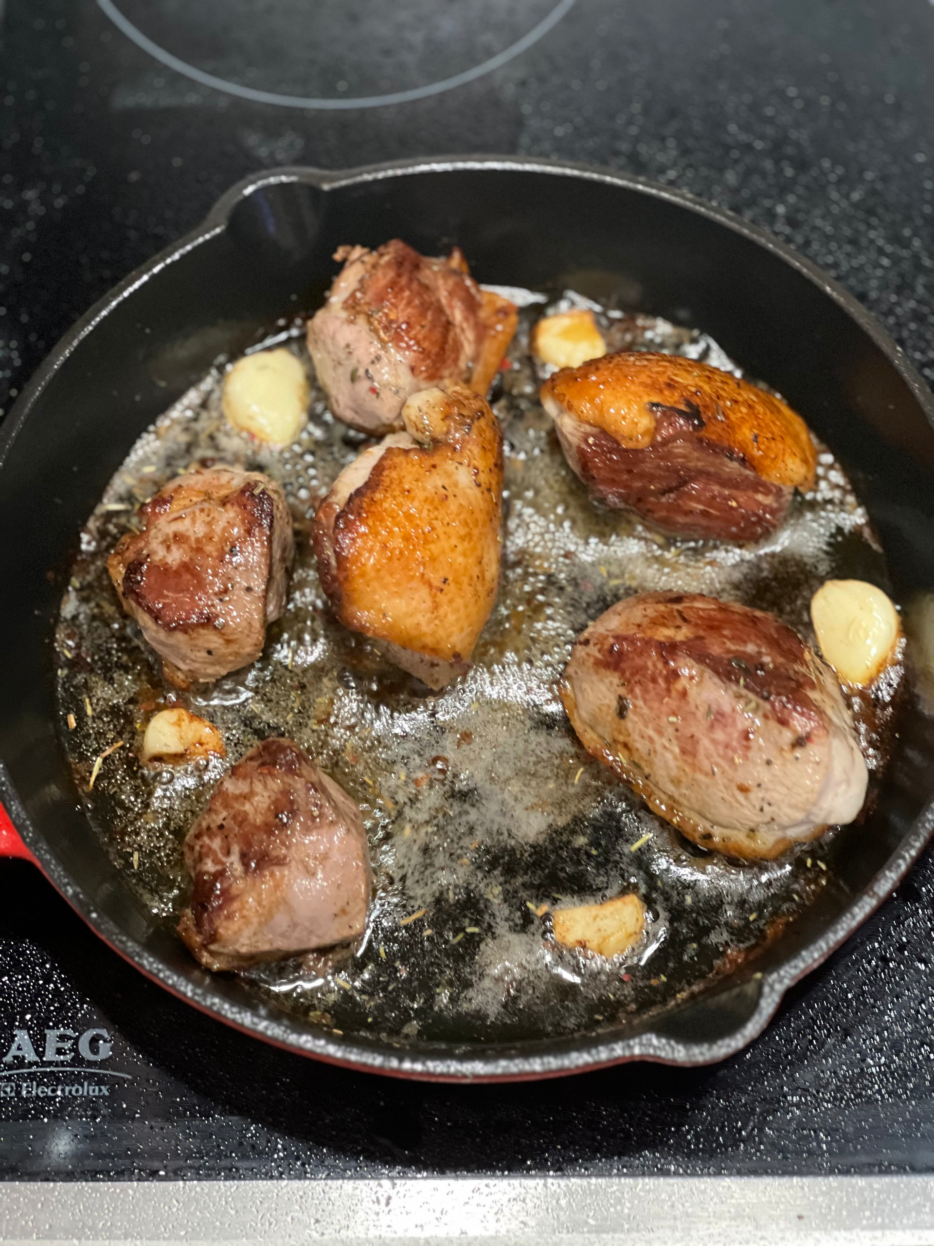 Это медальоны: 3 минуты на сильном огне на шкурке, 2 с другой стороны. И потом еще минут пять на среднем, постоянно переворачивая и поливая смесью собственного жира, сливочного масла, чеснока и трав.