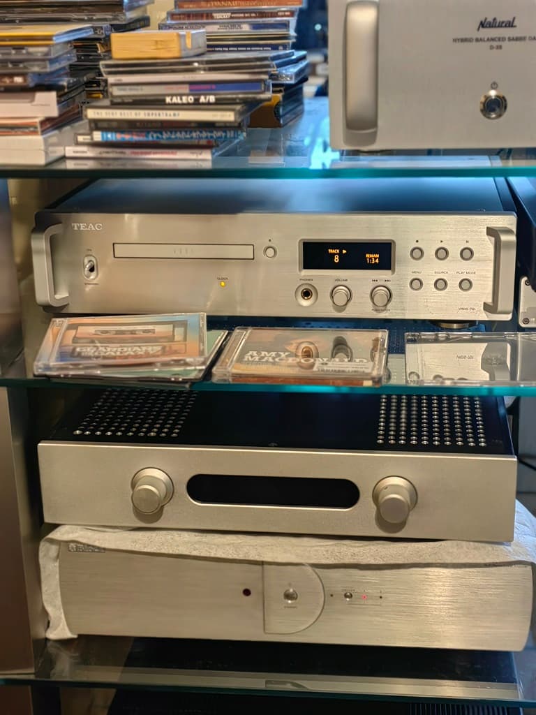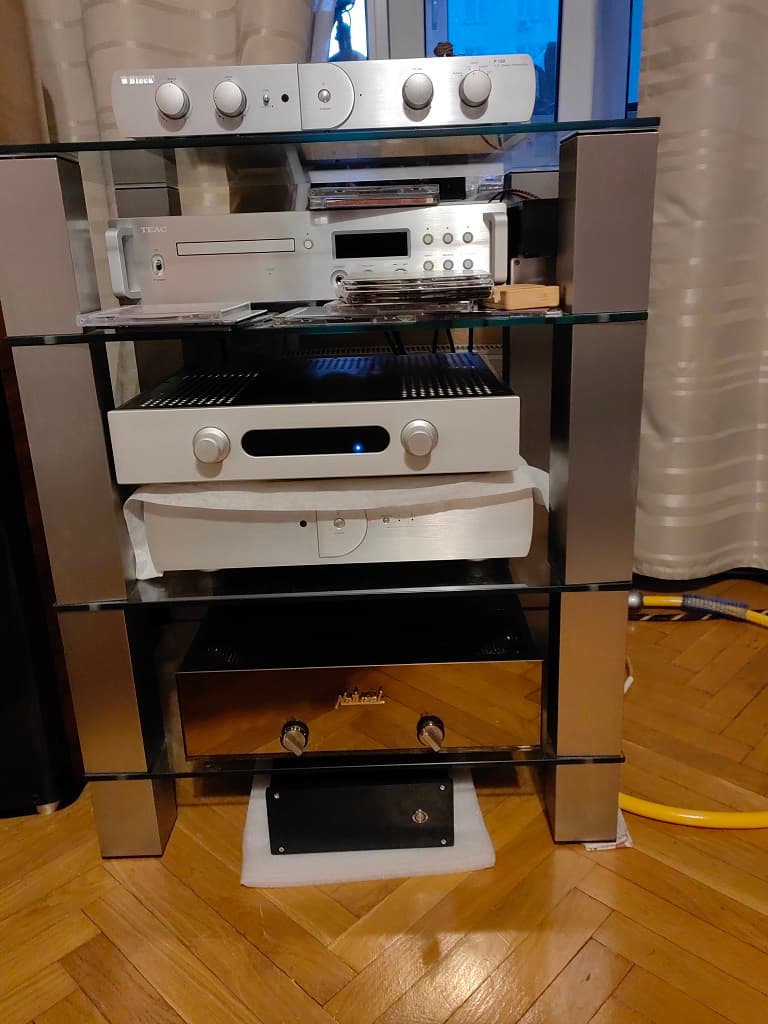 Аппарат я тестировал в своей текущей связке, центром которой являются пред и мощник от Audio Block (Р-100 и А-100). Источником является аналоговый выход из CD-плейера Teac VRDS -701, а дальше уже звук подаётся по выбору на колонки Natural Audio омниполярники или Line-R (на мощнике два набора выходов и удобно можно переключаться между двумя наборами акустики). Главное удобство, что во всей конфигурации пред можно было легко заменить с Audio Block на тестируемую модель, сравнить как по звуку, так и не менять остальную кабельную обвязку (кабеля делали тоже Natural Audio, акустические сами плели, межблочники они паяли из отобранных фабричных кабелей). У предусилителя четыре входа в виде четырех разъемов RCA (тюльпанов), поменять коробки и переткнуть обвязку особого труда не составило. И по размеру он тоже влез в стойку на место предусилителя Audio Block, как будто всю жизнь там и стоял.