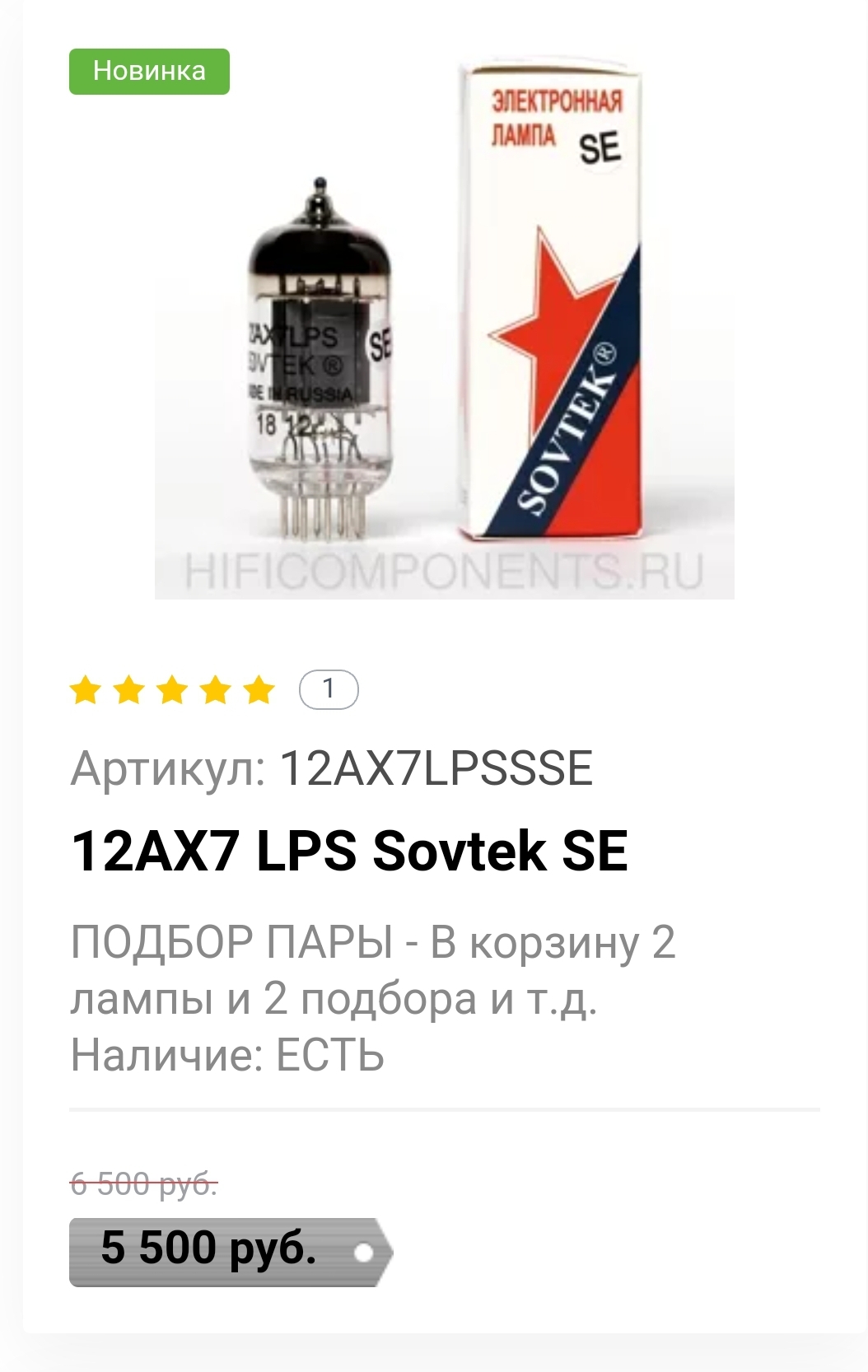 Что касается 12AX7LPS Sovtek SE : О… Это вообще отдельная тема. Признаться, как только я их услышал -их звук даже вызвал у меня довольную улыбку. Пожалуй, это лампы обладают самым ламповым звуком, из всех, что я слышал. Звук у них такой округлый, полнотелый, мягкий с внушительным впечатляющим низом и верхами ненавязчивыми но в то же время довольно обильными и доходчивыми во всех деталях. Как-то нестандартно, где-то своеобразно, но лампы все же поют… Даже непонятно, как лампам все это удается! (Кстати, во всех Российских лампах, что я слышал, детальность в достаточной мере присутствует.)
