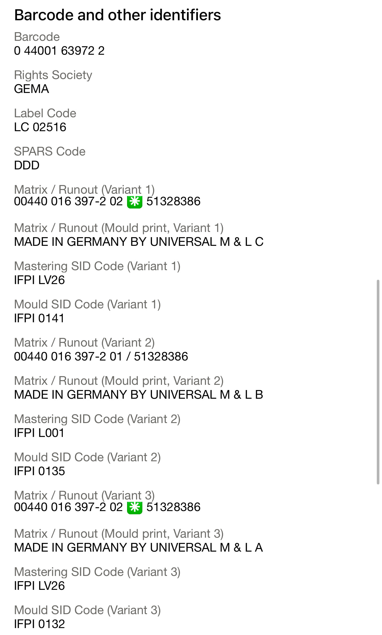 Наконец нашел тот самый. В предыдущий раз был невнимательный. Взял более поздний репресс уже с колом ARVATO на матрице. Баркоды одинаковые, а вот коды на диске уже разные. Хотя тоже германия.