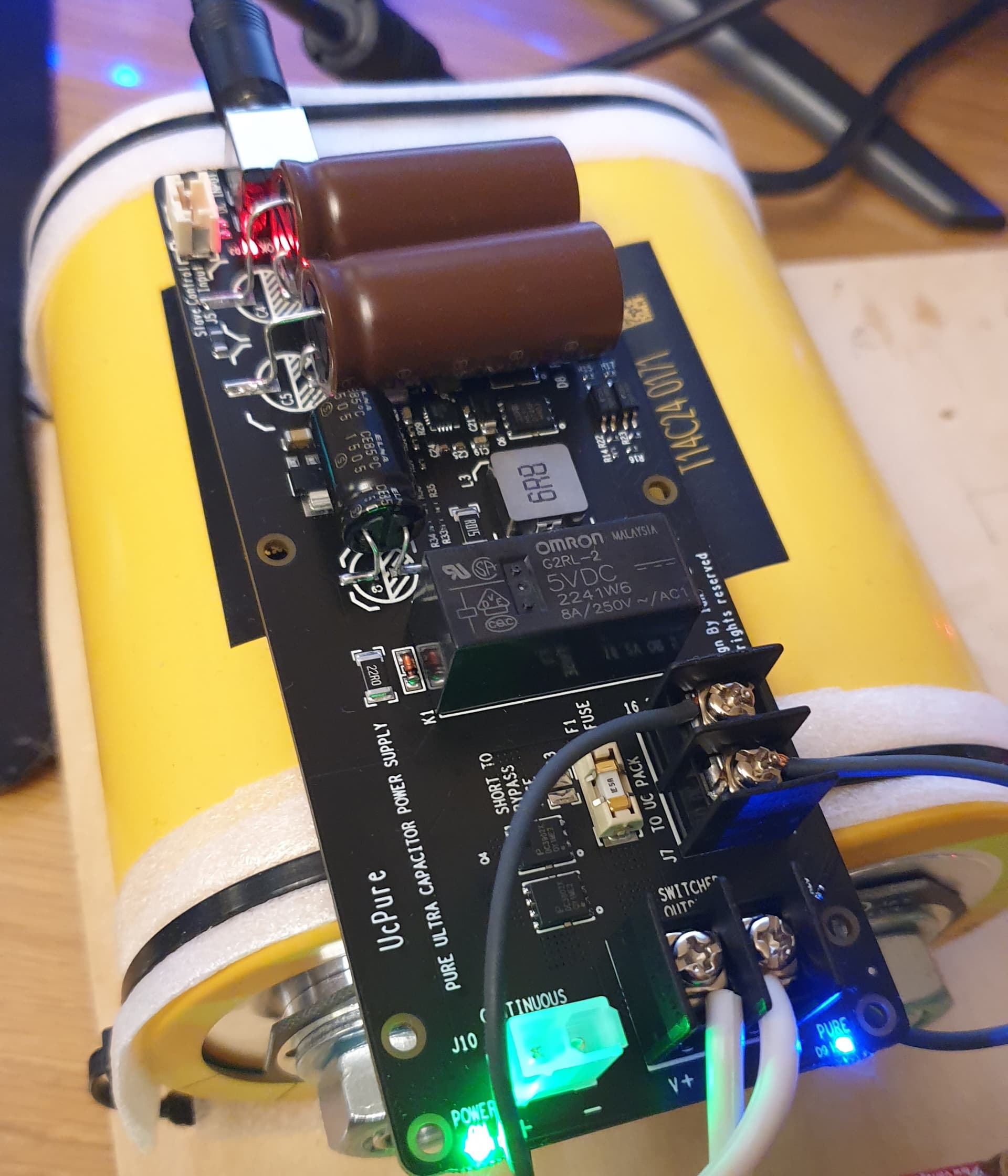 Потестил на днях. Идея БП очень классная, конденсаторы на 3000F заряжаются 3 мин., а после разряжаются (в моем случае для шляпы с 3,3в до 3,0в в течении 3 часов) после снова подзарядка. Низкий ESR, чудовищный ток разряда, что то около 700А! Рай для звука!
