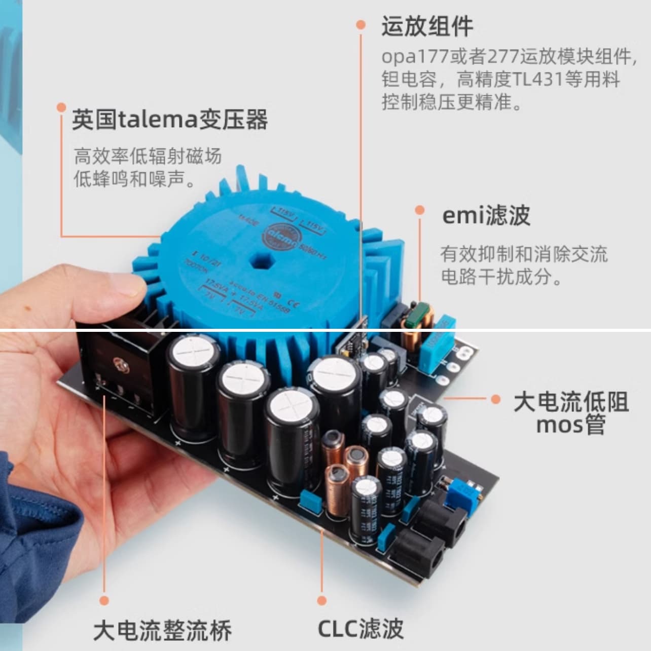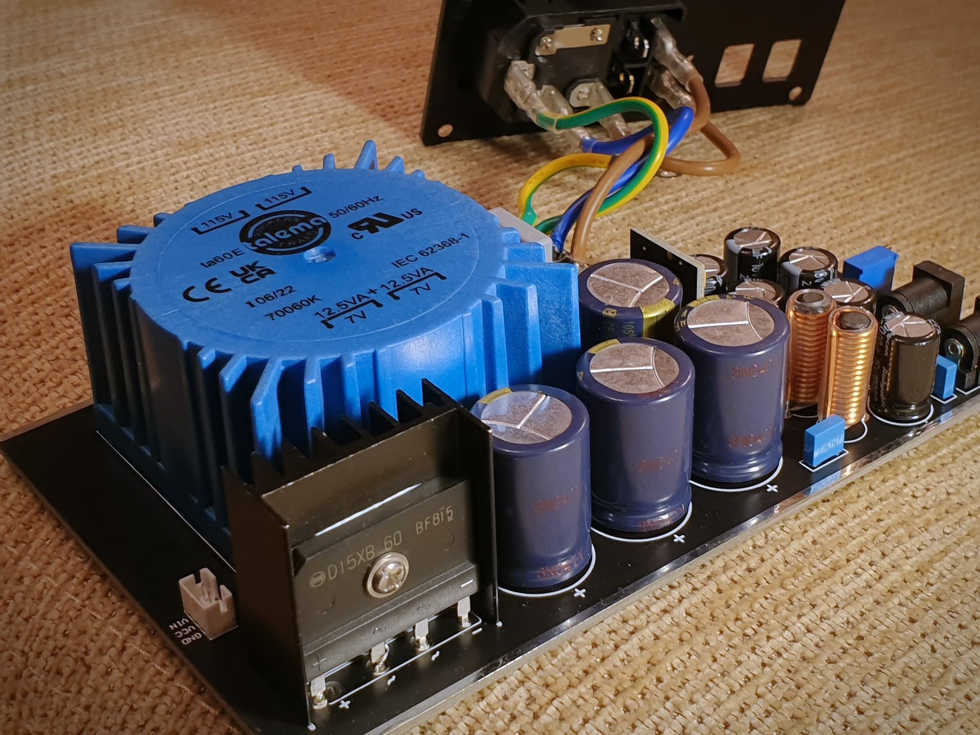 Panasonic FK в качестве основных фильтрующих конденсаторов уже с завода, трансформатор Talema, зачётная малошумящая схема ИОН-ФШ-ОУ по заветам Дмитрия Андронникова, где TL431 в качестве источника опорного напряжения, операционный усилитель OPA277, с умощнением полевым транзистором.