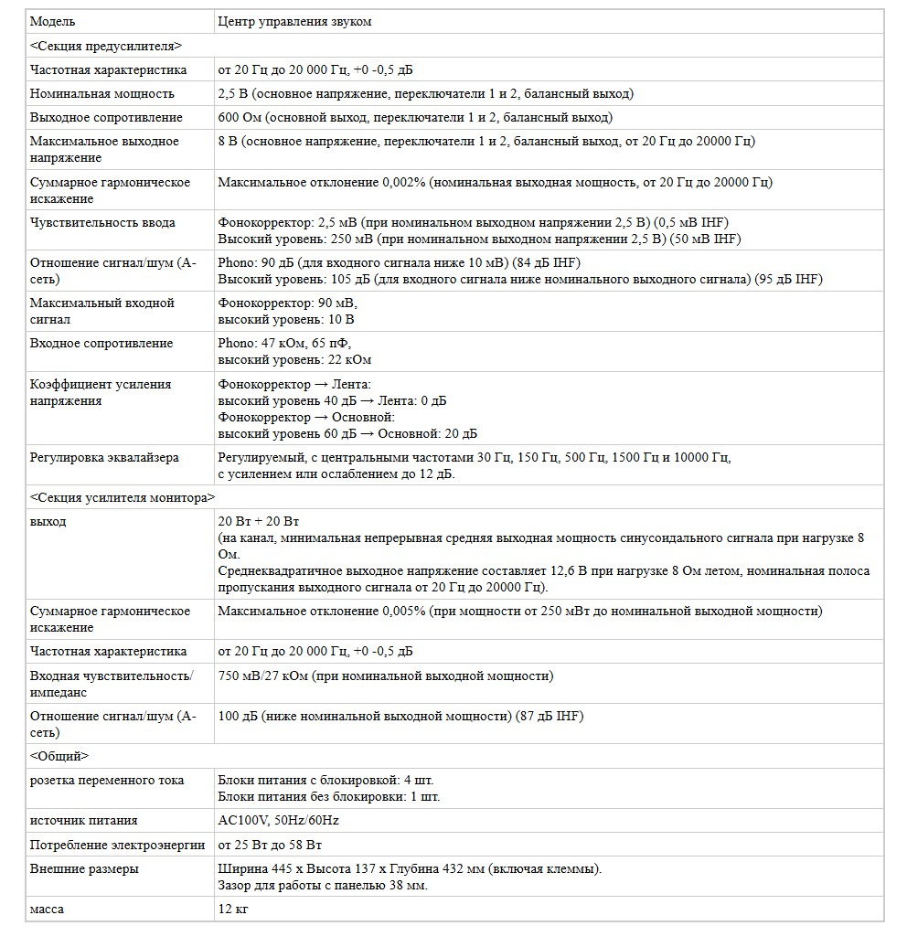 Краткое описание - в отличном техническом и косметическом состоянии, 220 Вольт. Балансные и небалансные входы/выходы, плавная тонкомпенсация, 5-и полосный эквалайзер, звуковой экспандер/компрессор, встроенный полноценный усилитель мощности на реальных 20 Вт (можно подключать колонки без дополнительного усилителя мощности), отличный фонокорректор MM. Для любителей писать на ленту вообще находка по части коммутации и режимам работы. Шнур питания встроенный, установлена вилка IeGo 8085G.