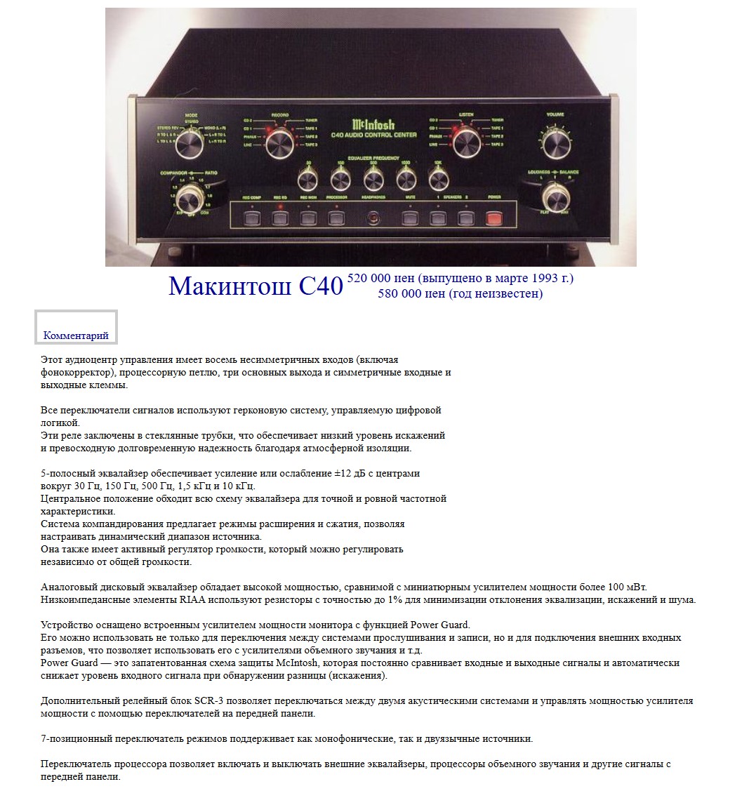 Предварительный усилитель McIntosh C40, был топовым в 90х, самый пожалуй навороченный по функционалу предусилитель у Mcintosh, в штатах очень ценится почитателями фирмы.