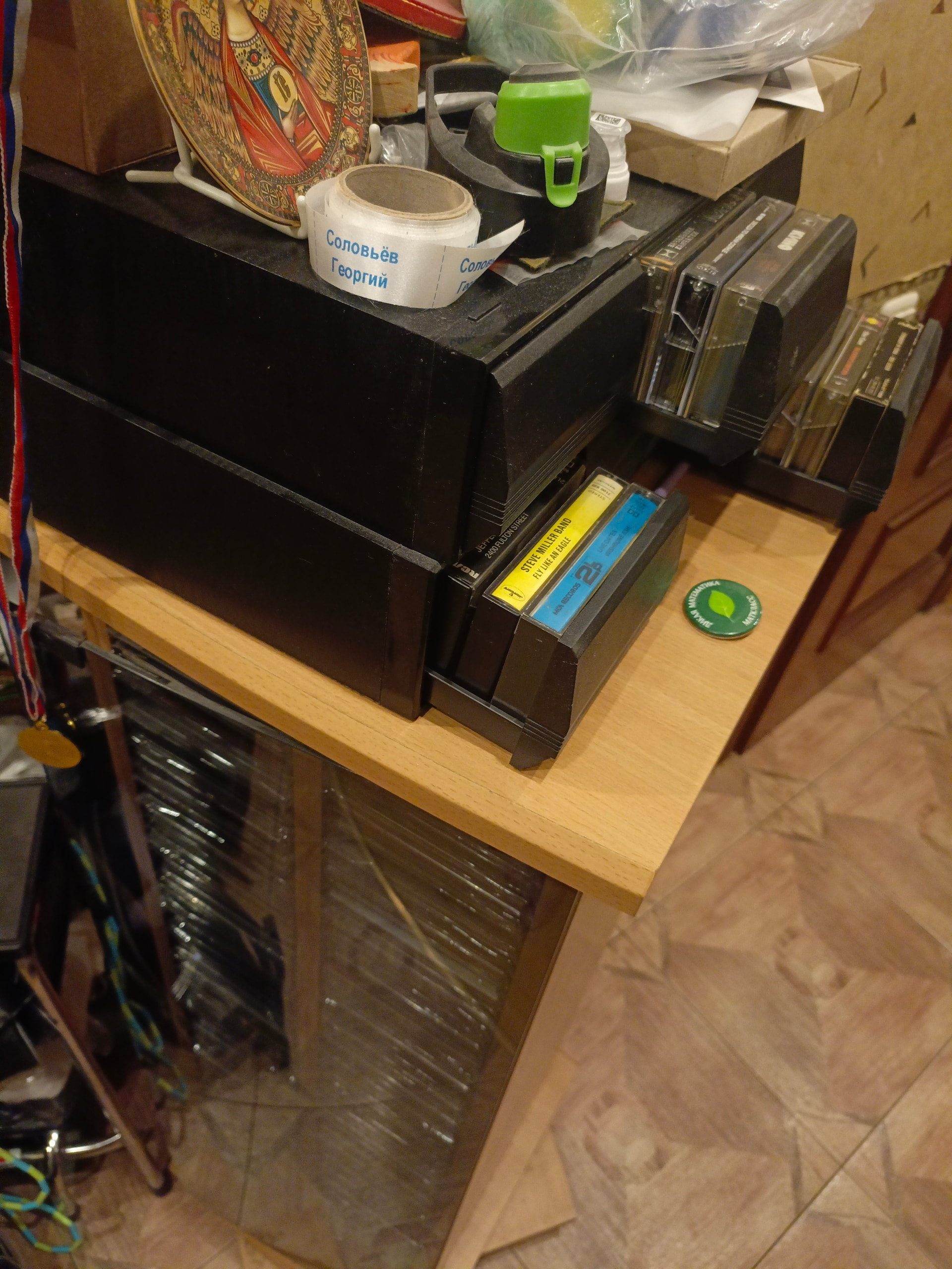 Оч удобную вращающуюся стойку купил в баре, винтажные ящики для кассет в uk, то что более менее часто слушается - все тут, остальное в картонных коробках под кроватью, регулярно устраиваю ротацию
