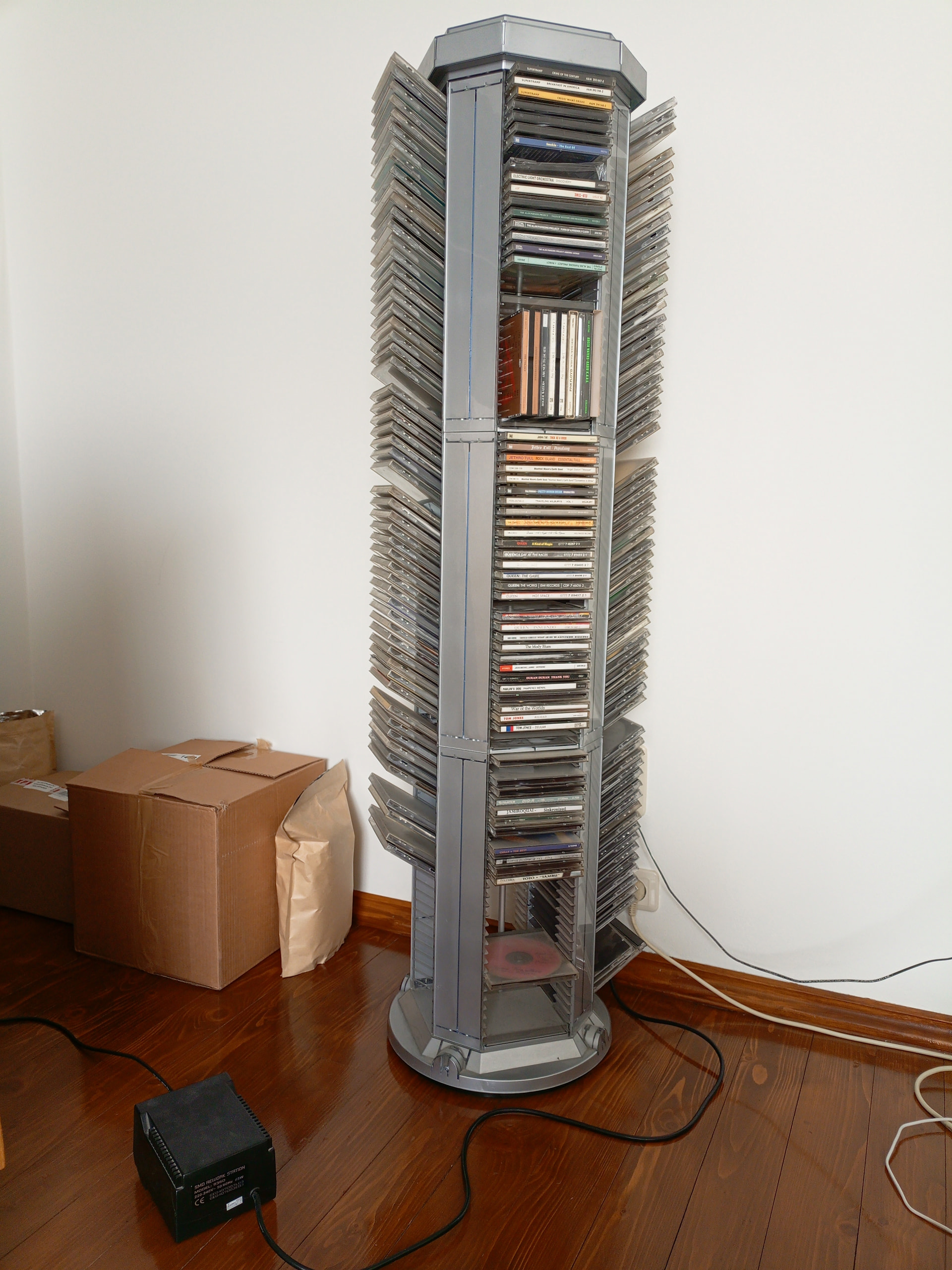 А вот очень давно покупал стойку под CD, поворотная, компактная, вмещает около трёх сотен дисков, мне кажется удобной, да и мне достаточно, компакты я видимо больше не буду покупать, ну мне так кажется))