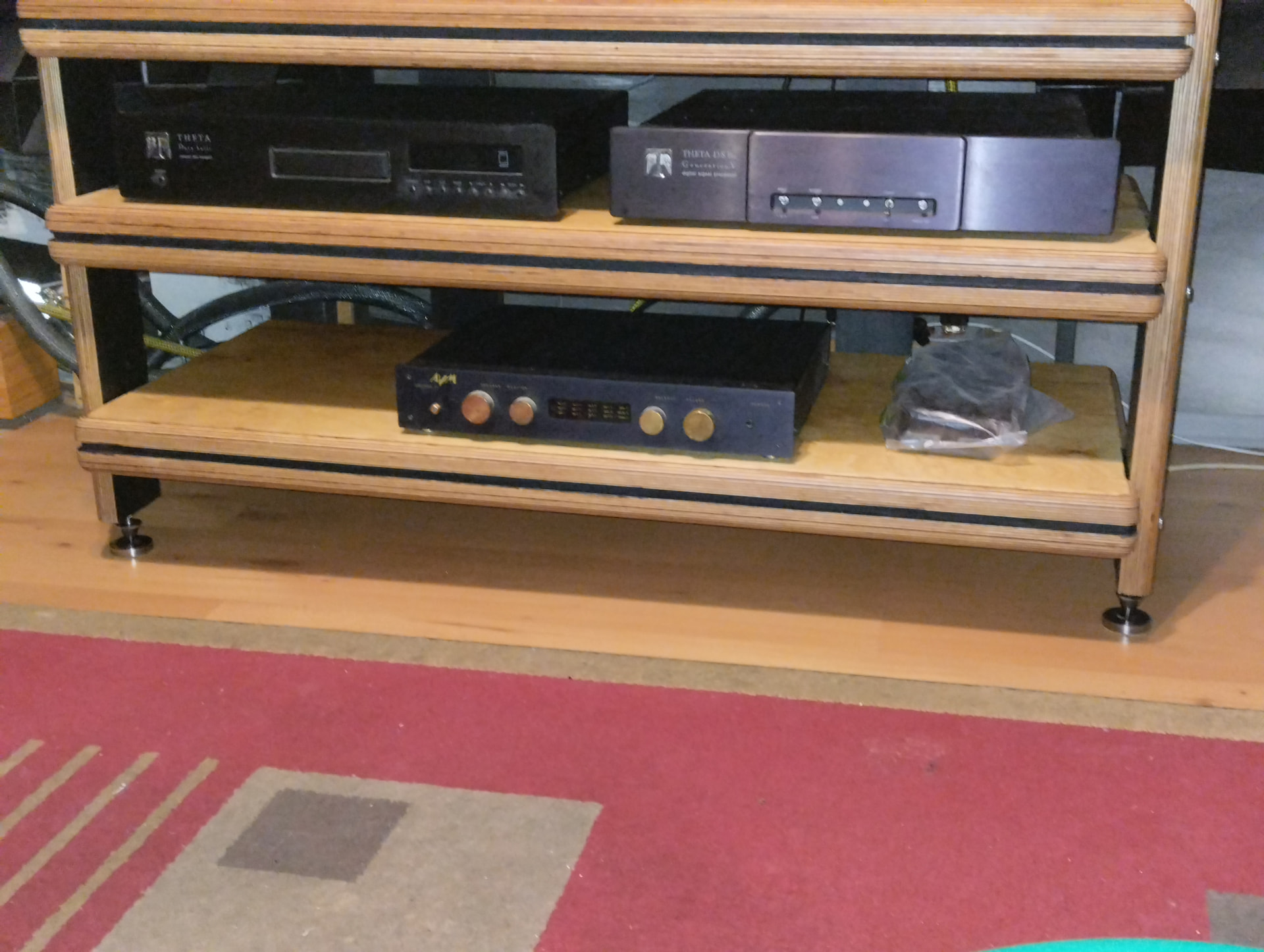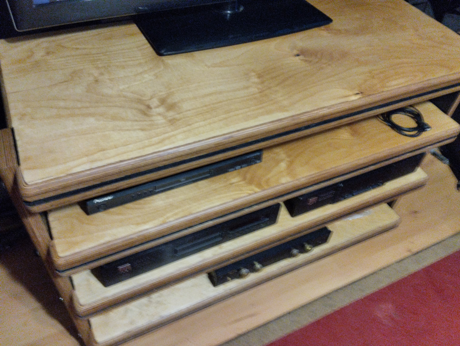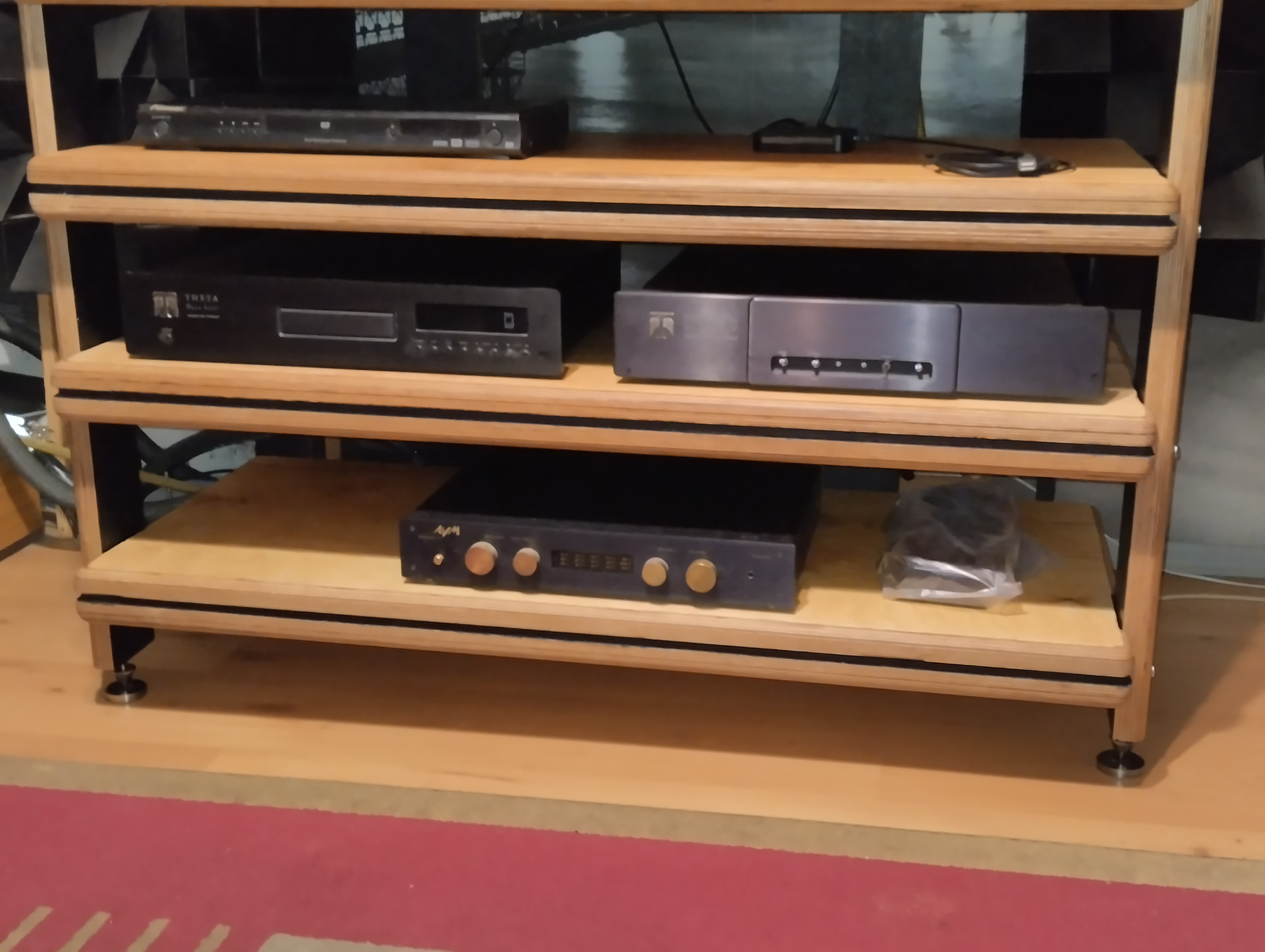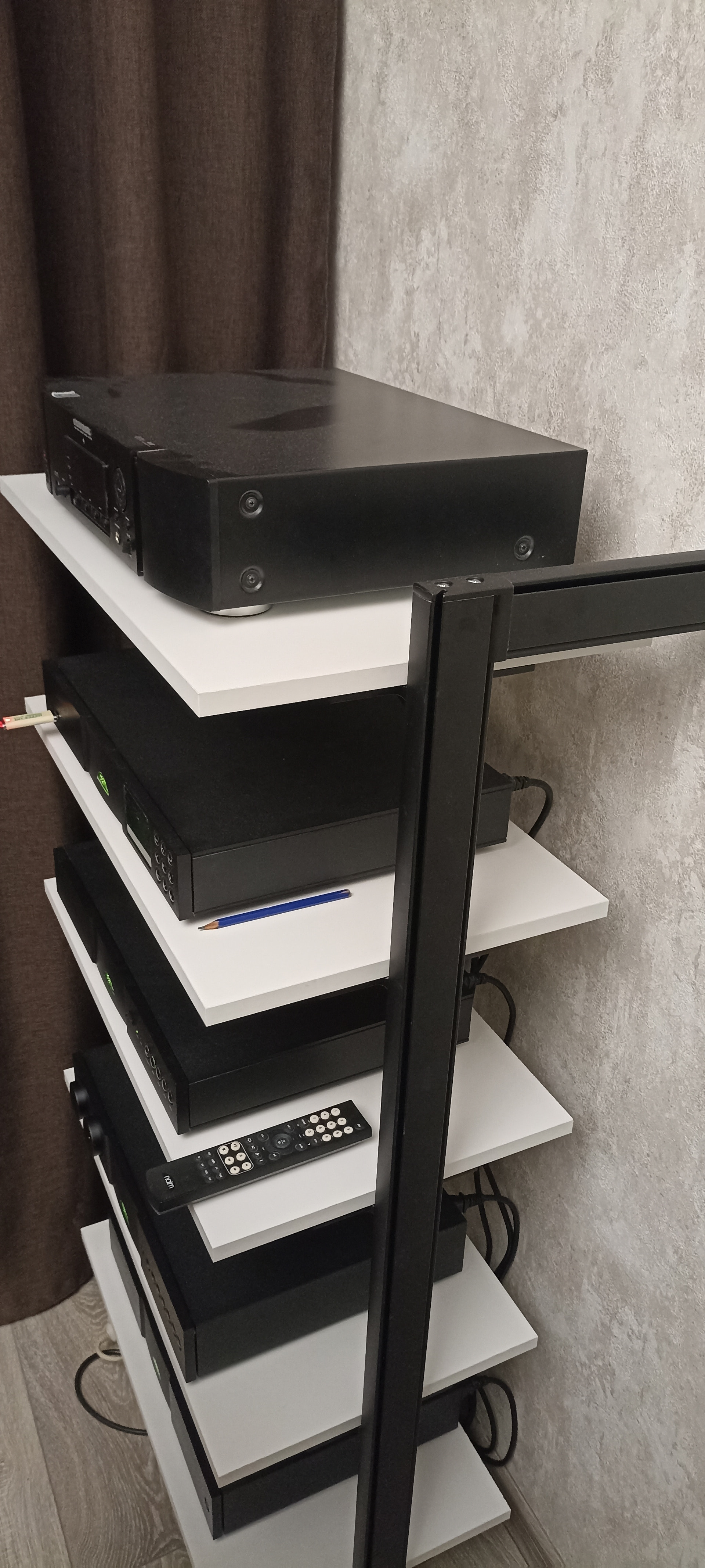Но можно на половину глубины полки пленку черную приклеить. Из-под аппаратуры не видно, а свет блокирует.