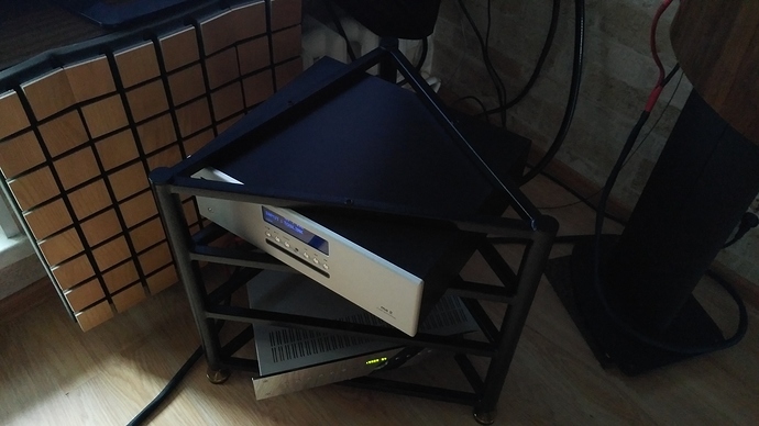 На нижней полке размещены многоканальный мощник и ресивер, на средней ЦАП и ламповый интегральник, на третьей акустика центрального канала, поверх которой стоит стример, а вокруг центрального канала размещены большой заказной блок питания и множество девайсов для воспроизведенния музыки с SSD/HDD.