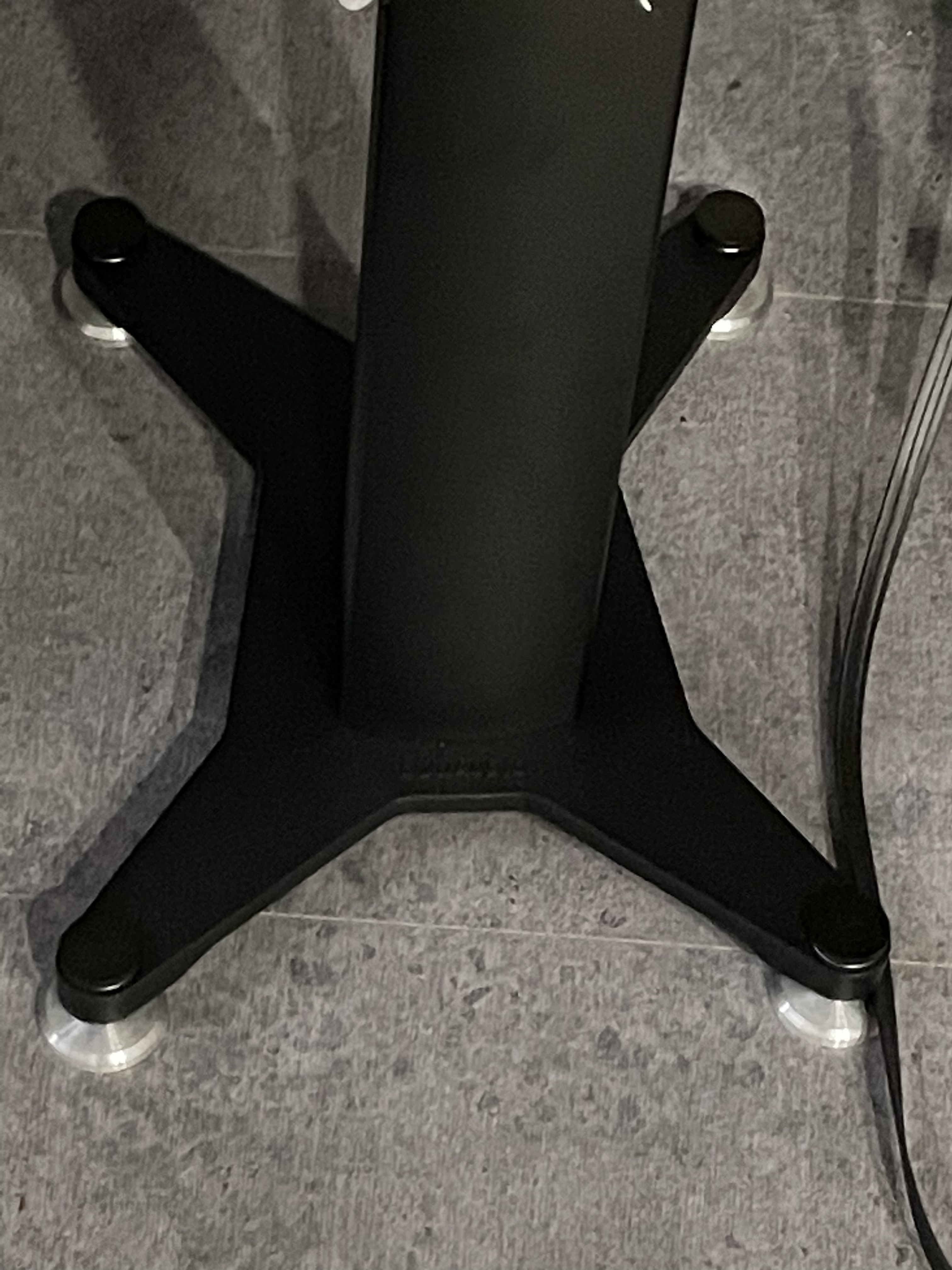 Ставлю колонки на стойки. Стойка Динаудио. На четырех шипах и подпятниках. Шипы крутятся сверху, очень удобно.