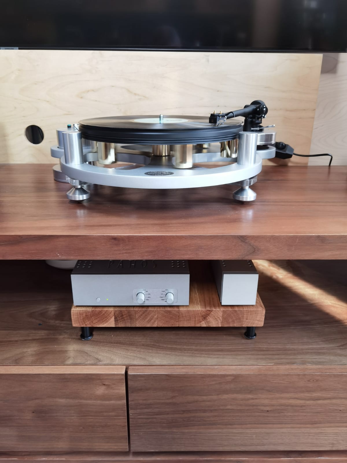 Поставил иголку Audio Technica AT33PT GII (раньше была ММ) + отдельный фонокорректор Pathos in The groove. О аудиофильские боги! Ответьте, есть ли звук еще лучше?? Высоки просто прорвало. Четко слышен удар щеточкой по тарелке и затухание. Бас стал быстрее и очень собранным. Кабель силовой от фонокорректора не соосен с дыркой в задней стенке стойки