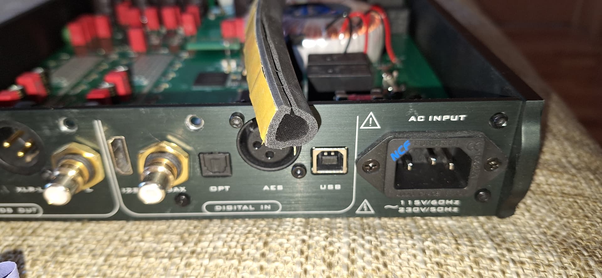 И когда возникают акустические вибрации на столешнице, этот, наименее нагруженный угол корпуса вибрирует сильнее и это передается на крышку ЦАПа, которая плохо задемпфирована.