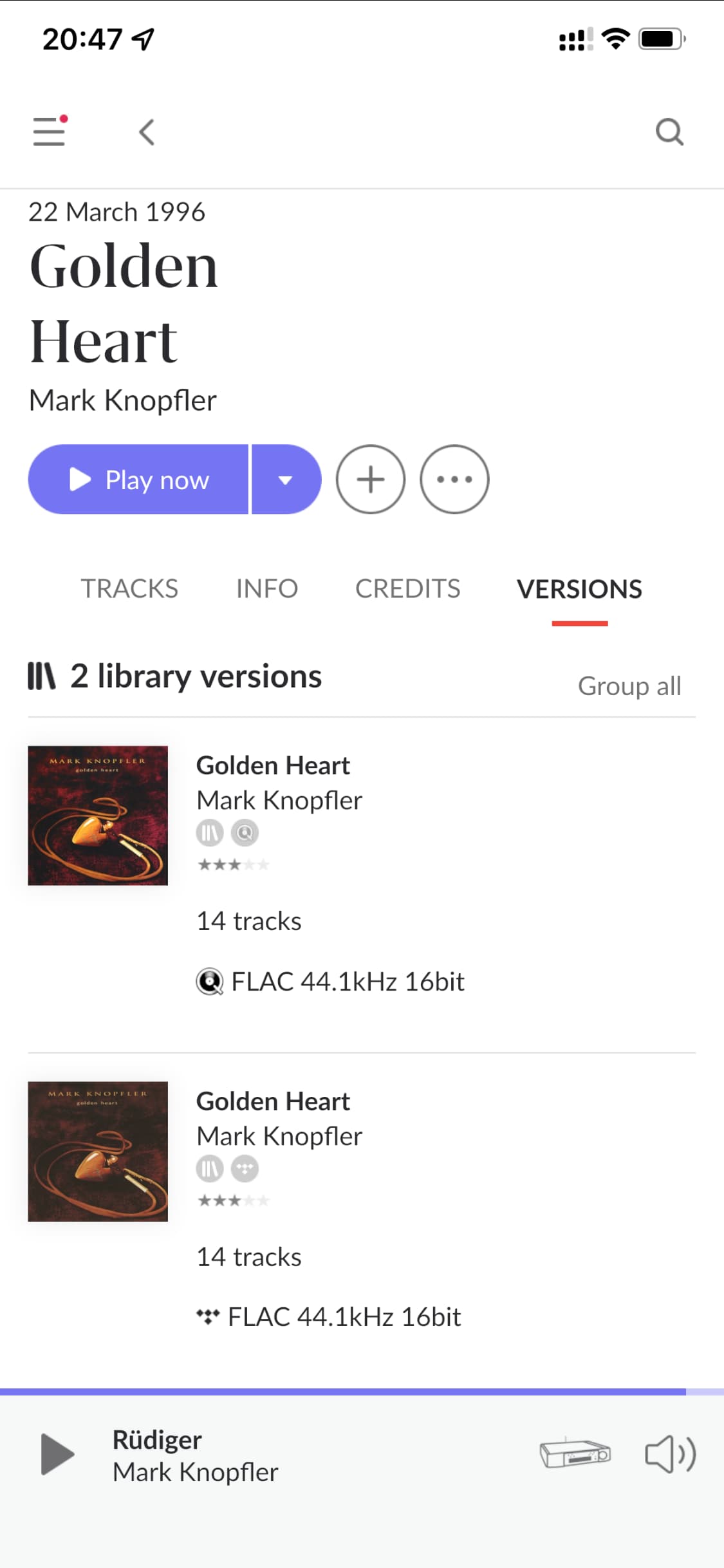 Tidal/Qobuz, занятная разница. Есть такой альбом на CD - Mark Knopfler “Golden Heart”.