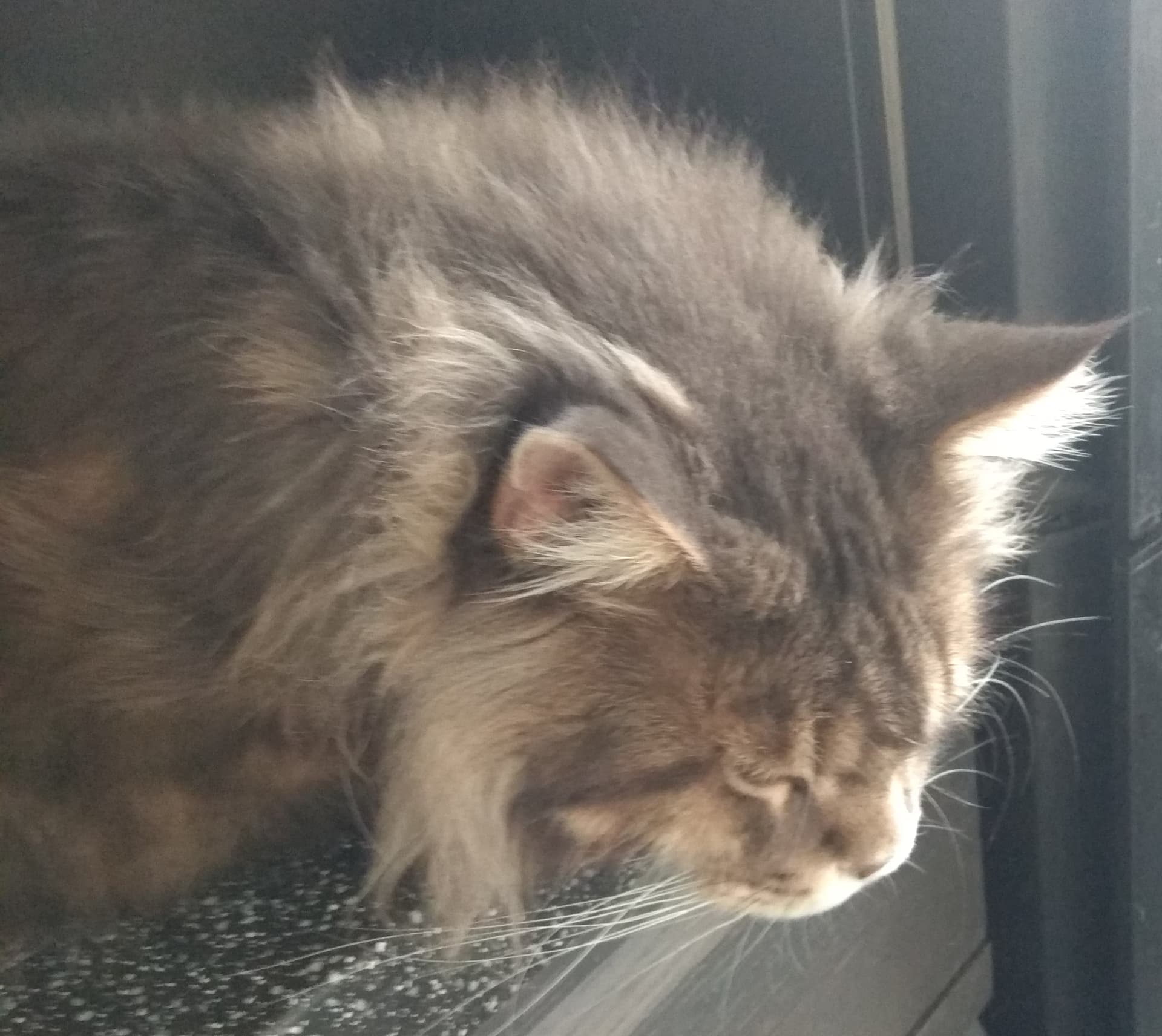 Огромный, страшненький, с поврежденным глазом, но очень смышленый. Знает, как обратить на себя внимание. Очень ласковый.