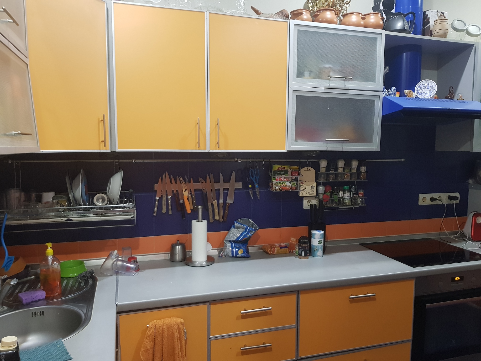 У меня тоже старая кухня есть, все руки никак не дойдут поменять на новую, очень не люблю все эти бесконечные ремонты. Несколько лет назад купили две банки краски и покрасили ее с женой за вечер, ну и попутно я наждачкой убрал “позолоту” с ручек. Сейчас бы покрасил, пожалуй, просто в белый, не сразу пришло понимание, что чем меньше цветов и деталей в интерьере, тем лучше. Но все равно до этого было хуже, старые фасады были в совсем уж плохом состоянии и мерзким рисунком “под мрамор”.