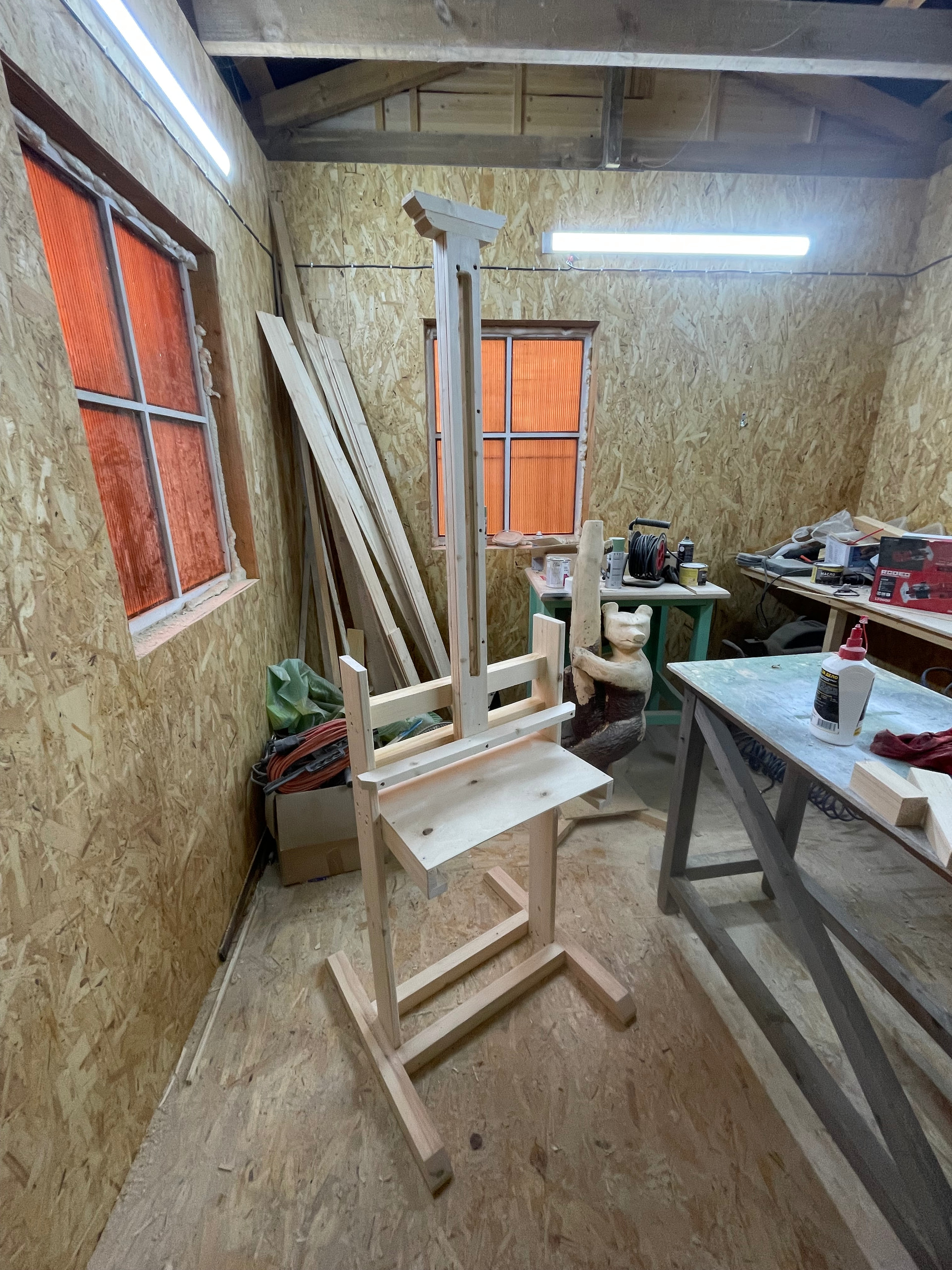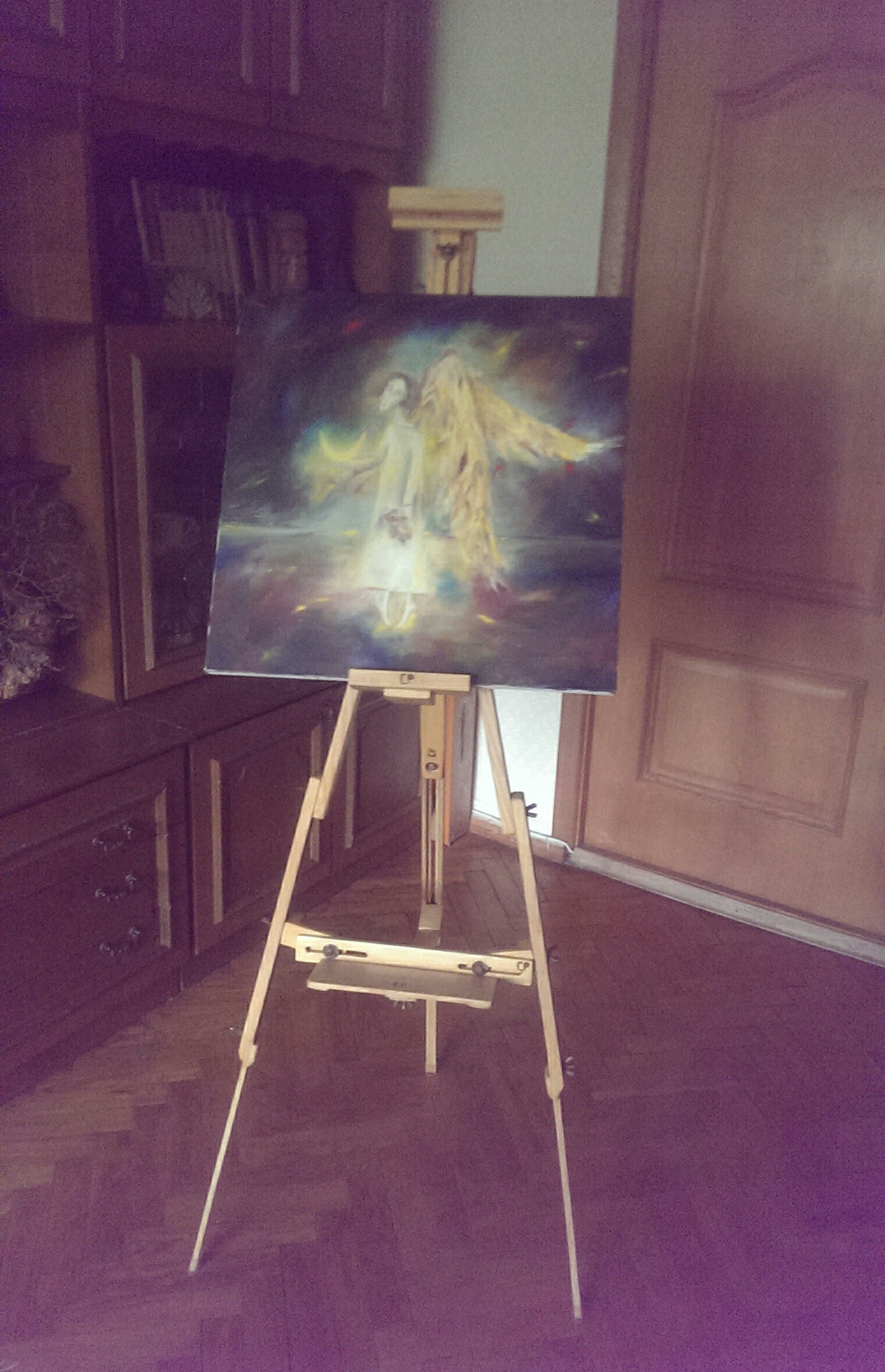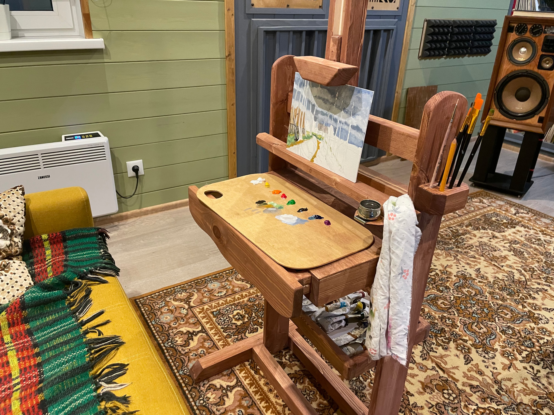 Хороших фото этого мольберта как-то больше не нашел, а второй мольберт попроще и по больше сделал из сосны, хоть и разборный, но скорее для стационарного использования.