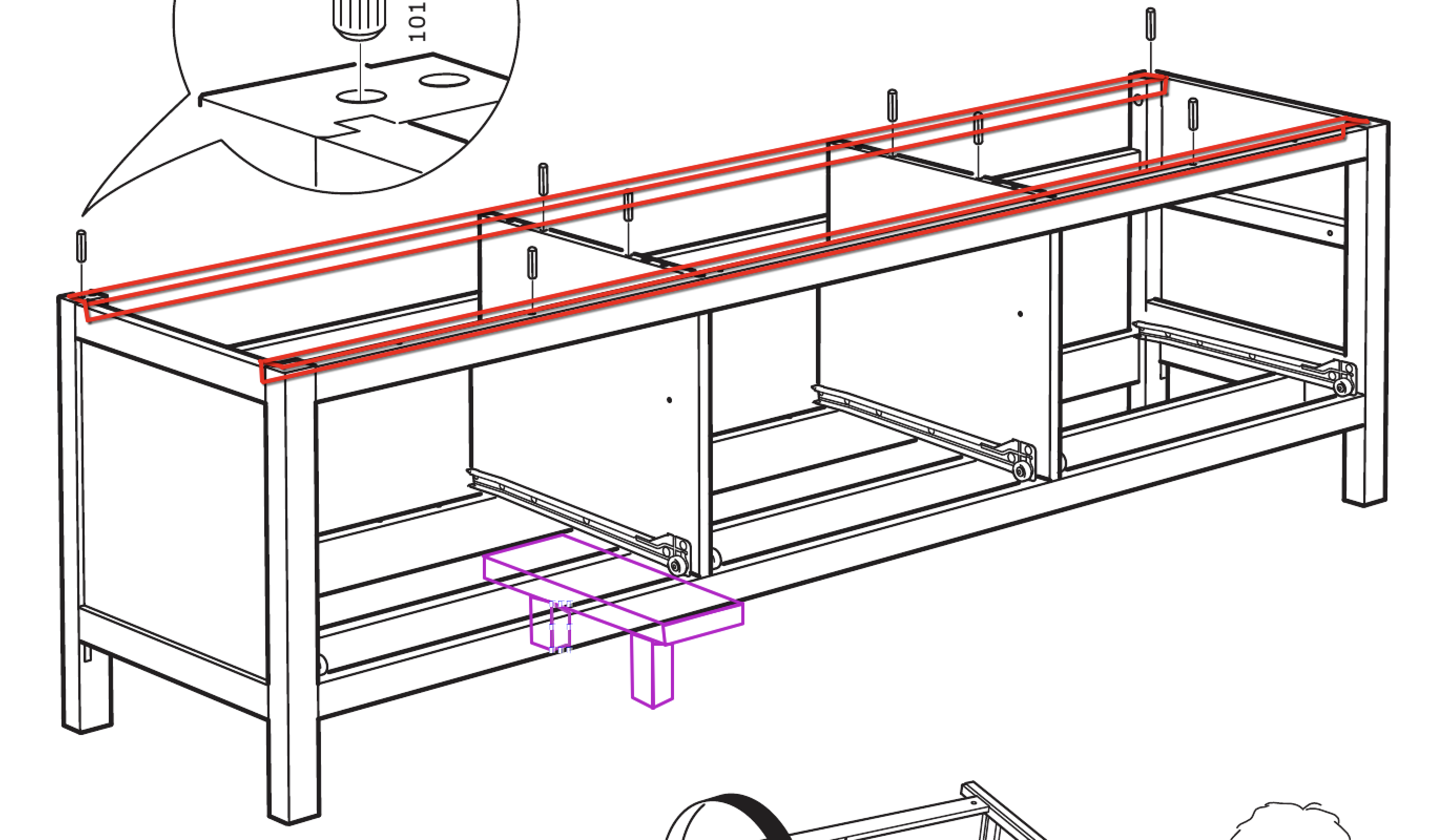 Не вариант, так как нужно будет обязательно опираться на ножки тумбы, то есть выбирать пазы в ножках. Профиль конструкционный нормальный, который не будет прогибаться на длине 1,5 метра нужен толстый, его проосто не встроить без видимых артефактов в конструкцию тумбы