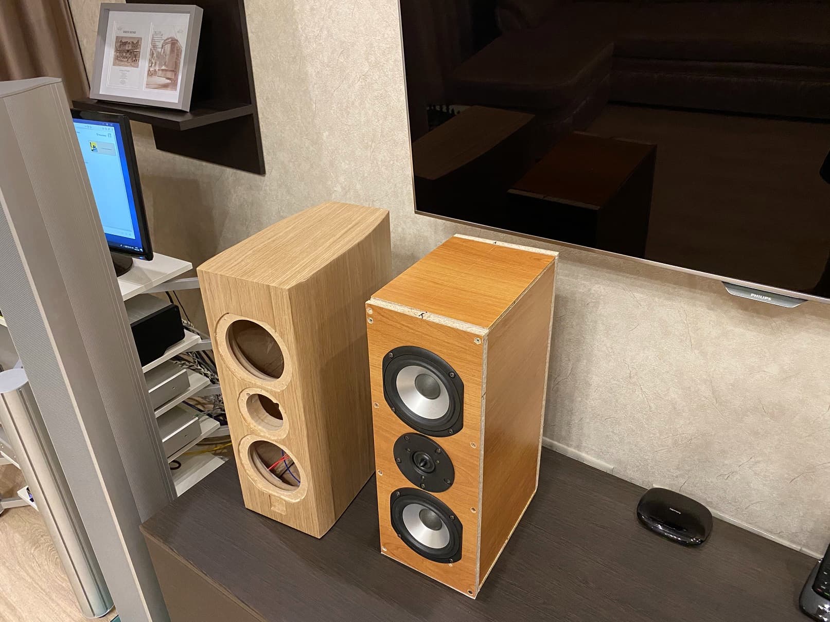 Пока идут клеммы для динамиков и прочая электрика, озаботился грилями. Идею с аутентичной металлической решеткой не бросаю, но пока не пойму, как реализовать… Запасной вариант- ткань. С тканью не умею работать от слова “совсем”. Поэтому решил упростить себе жизнь и изготовил… пяльца (ы)))))) Идея видна из фото. Зазор оставил по 1мм на сторону. Четр его знает, какая толщина ткани?? Ну, если толстая будет, то шлифануть внешний контур вставок- дело 10 минут.
