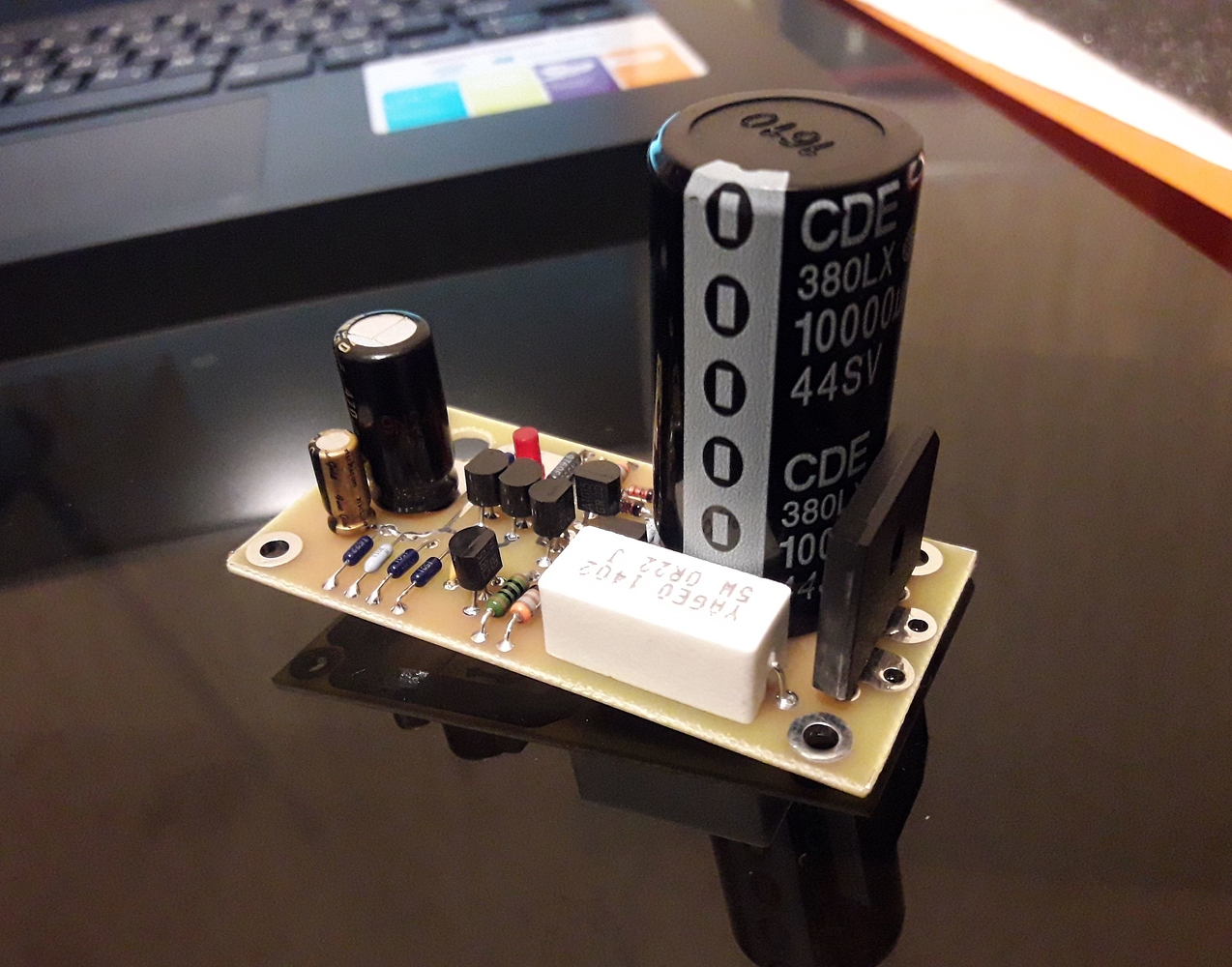 Размеры платы ширина 23мм, длина с транзистором 51мм, и высота 24мм. На плате есть всё - выпрямитель, электролит на 4700мкф, и полностью дискретная схема стабилизации. Резисторы все melf vishay, пара больших резисторов ohmite, smd транзисторы, опора на светодиодике сitizen. Платы сразу настроены на 5,25в, с нагревом там становится примерно 5в.