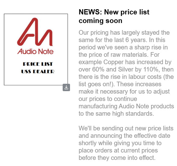 В течение последних 6 лет наши цены оставались неизменными. За это время мы наблюдали резкий рост цен на сырье. Например, медь подорожала более чем на 60 %, а серебро - на 110 %, кроме того, выросла стоимость рабочей силы (список можно продолжать!). В связи с этим ростом мы вынуждены корректировать цены, чтобы продолжать производить продукцию Audio Note на прежнем уровне.