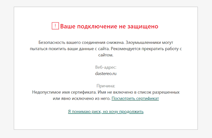 Мы тут где-то обсуждали, что сертификат выписан на “www.dastereo.ru”, поэтому.
