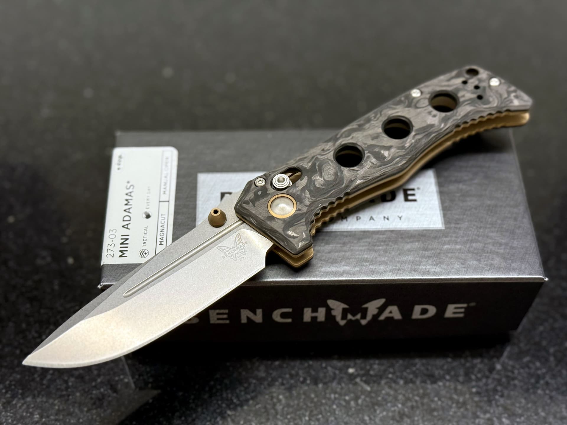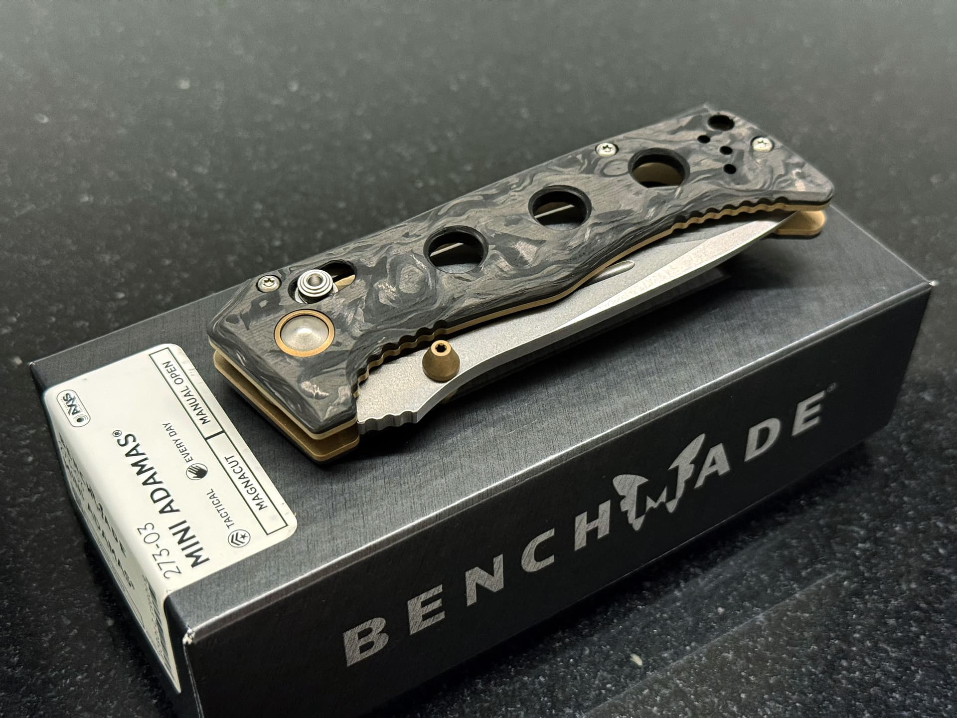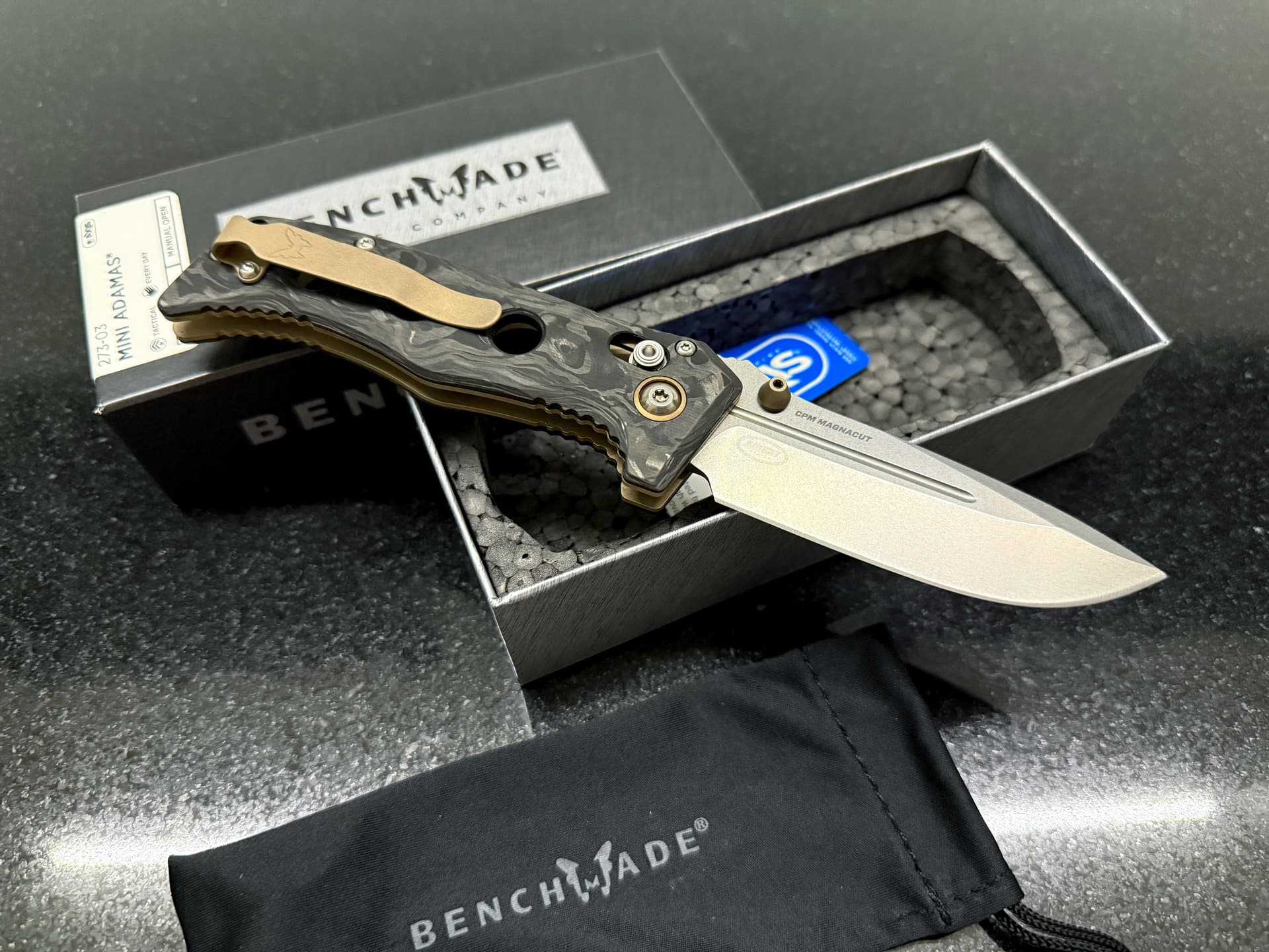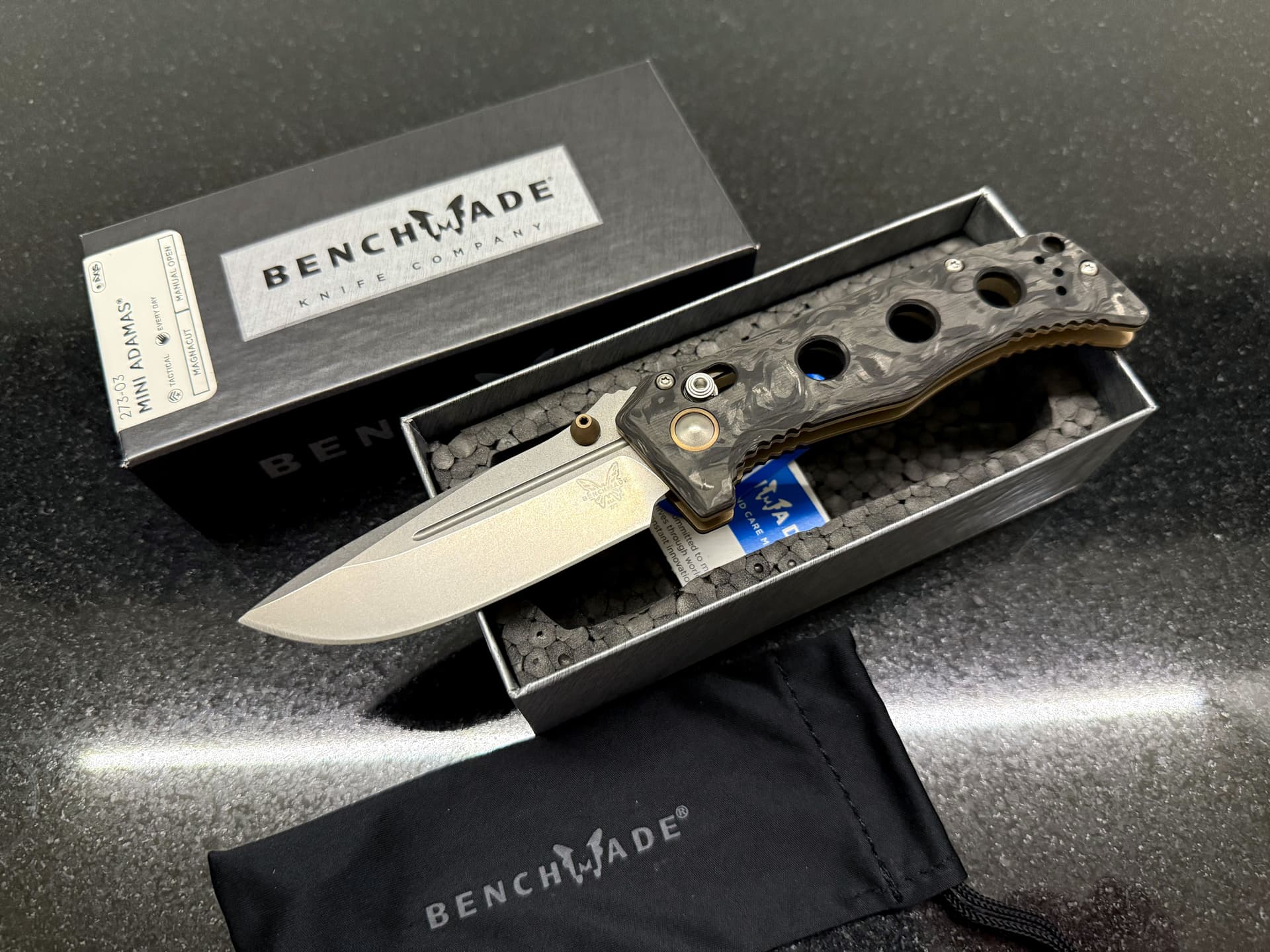 Не то чтобы большой фанат ножей, но этот Benchmade Mini Adamas прям очень понравился. Настоящий карбоний и какой-то модный Magnacut. Да, резать я им, конечно же, ничего не буду ![]()