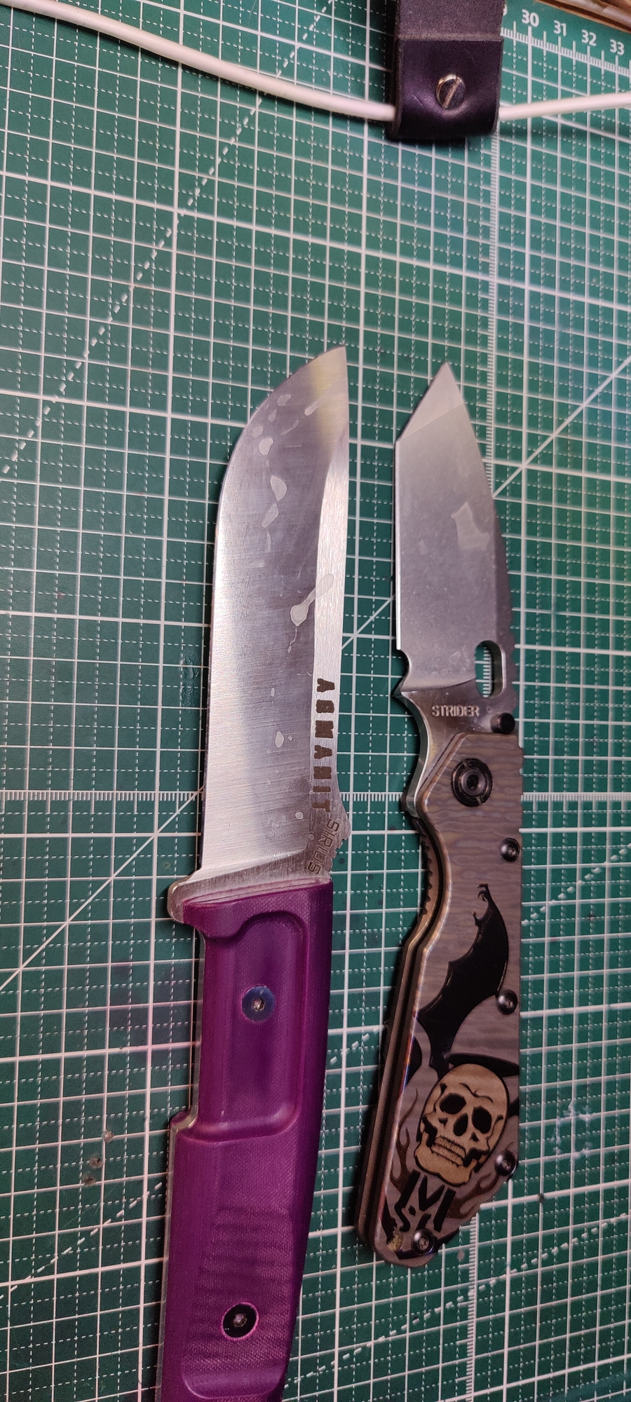 Слева N690 термичка Бурова hrc 61-62, лежит на кухне разделываю курицу, режу мясо.
