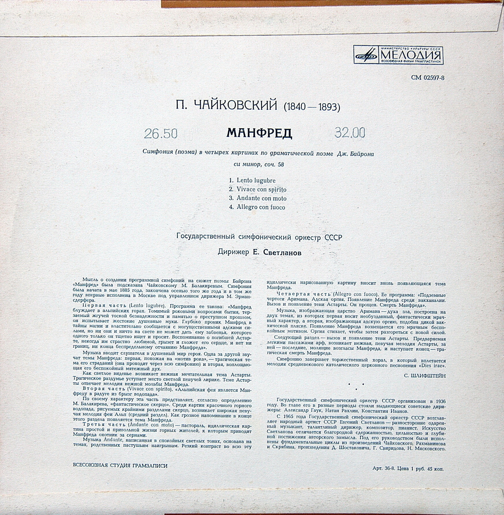 Исполнители: Государственный симфонический оркестр СССР. Худ. рук. и дирижер - Евгений Светланов. Соло на органе - Гарри Гродберг.