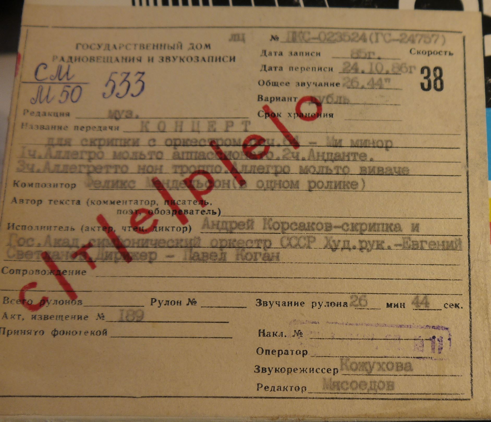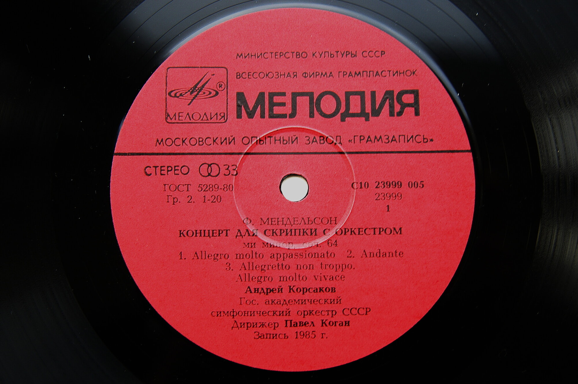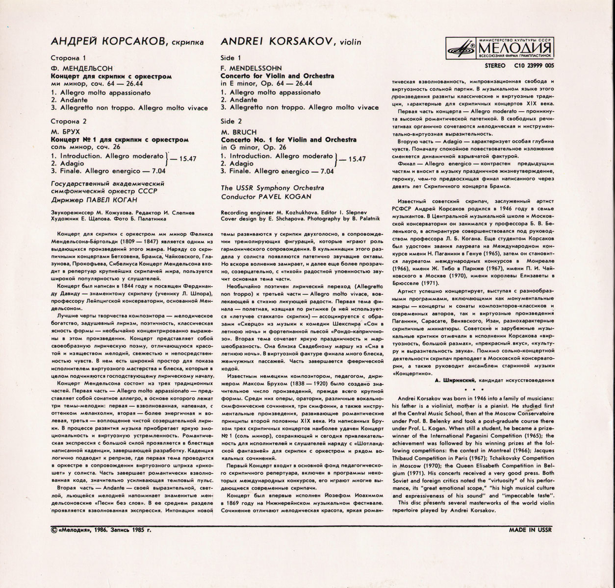 Исполнитель: Андрей Корсаков - скрипка и Государственный Академический симфонический оркестр СССР. Худ. рук. - Евгений Светланов. Дирижер - Павел Коган.