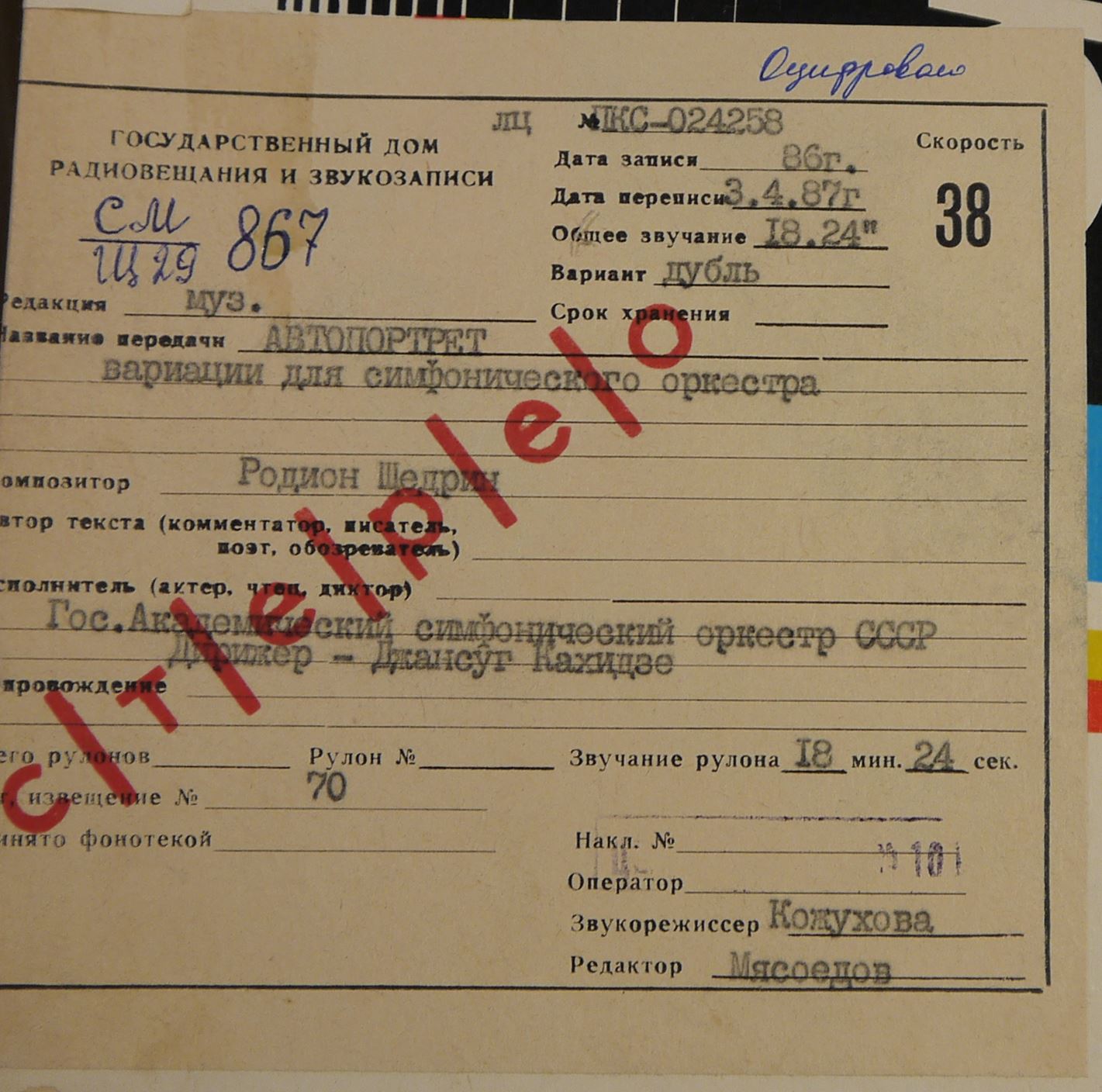 Исполнитель: Государственный Академический симфонический оркестр СССР. Дирижер - Джансуг Кахидзе.