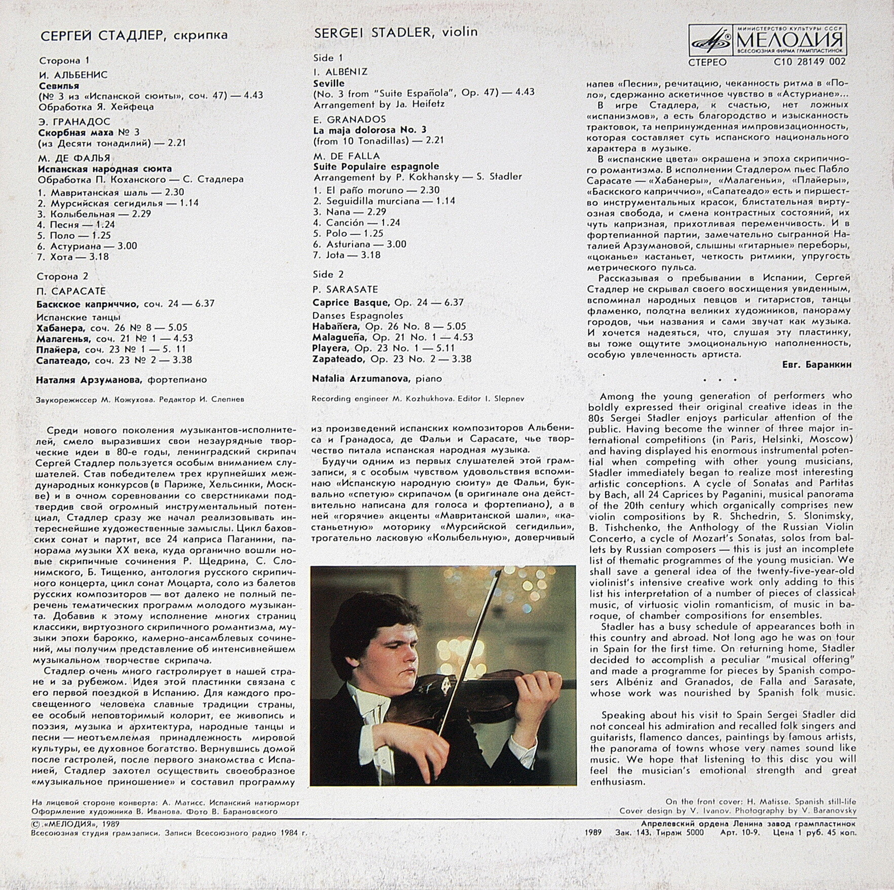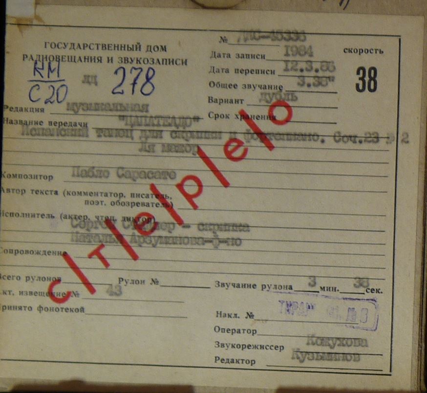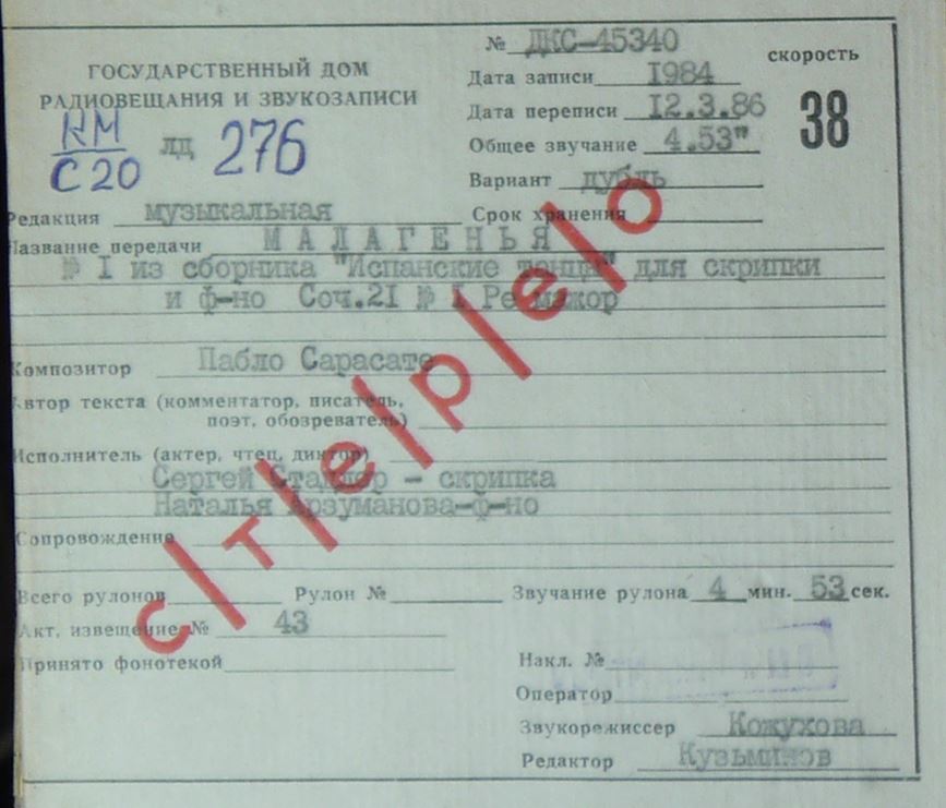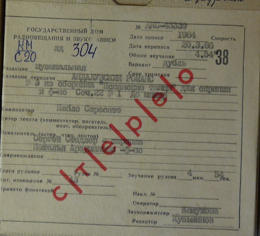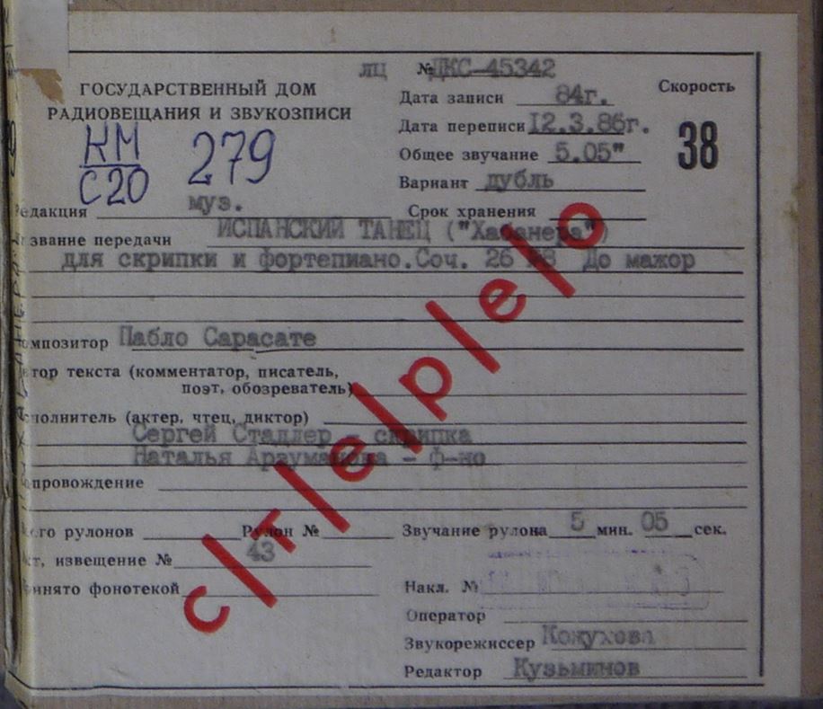 Исполнитель: Сергей Стадлер - скрипка, Наталья Арзуманова -ф-но.