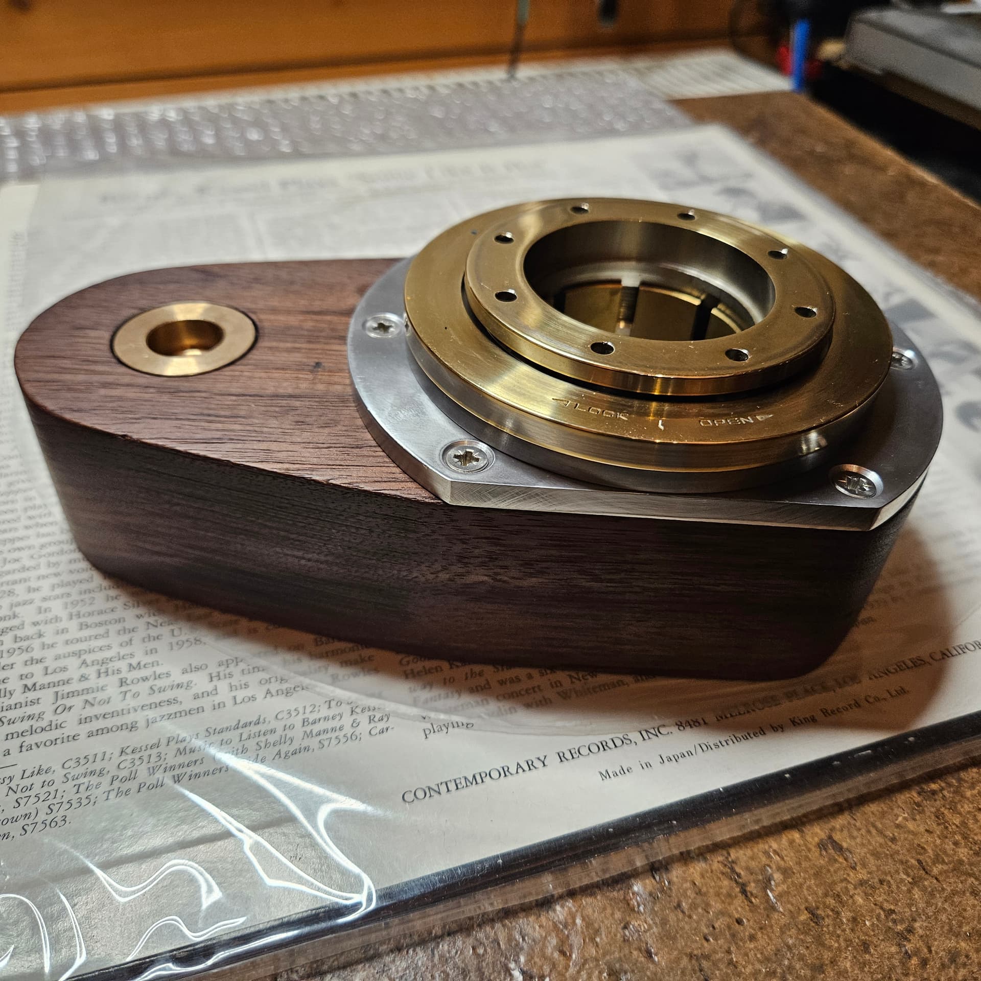 Обычная история на японцах. Винты - шпильки прикипают к корпусу. Плюс шлиц в виде точечных углублений. Видно микро подшипник на основании тонарма.
