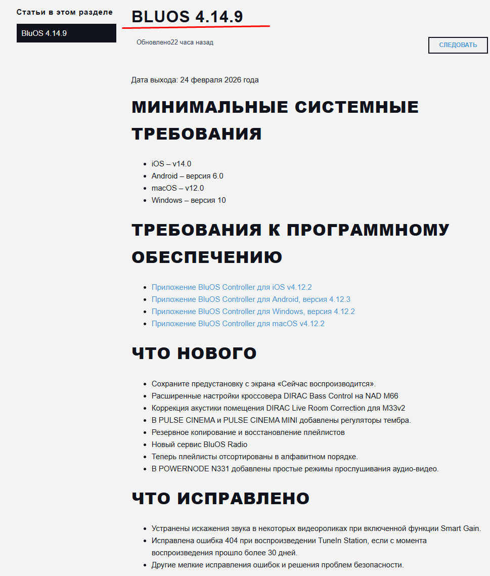 На роутере стоит квн , и всегда до сего дня обновления вставали без проблем. Но сегодня не обновился и загорелся красным светодиодом , я подождал 10 минут , потом отключил кабель питания на 5 минут . После этого заработал , но на старой прошивке. Повторно боюсь пробовать , как бы не " окирпичить" прибор . Пытался обновиться наBluOS 4.14.9. Released February 24, 2026.