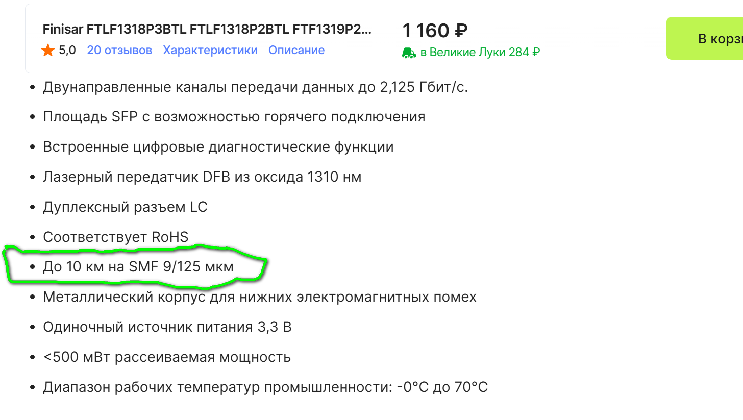 Вот я Вам обвел для примера на скрине характристики модуля Finisar FTLF1318P3BTL ( SMF )