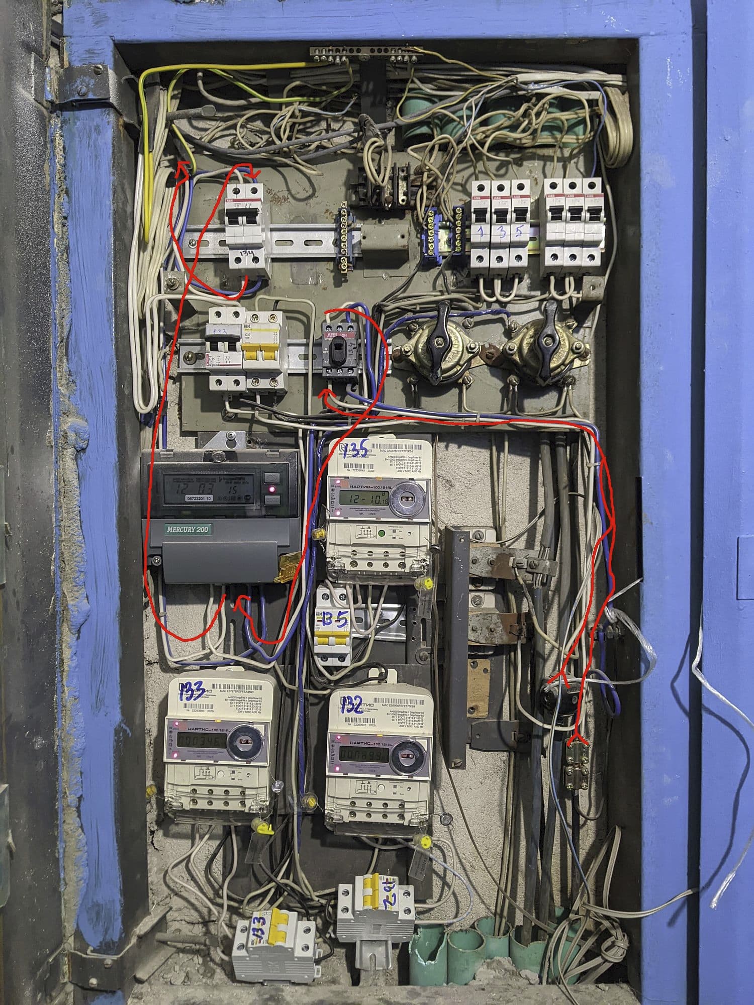 У меня на пути до аудио - аж три рубильника получилось. Сейчас глянул этажный щиток. Автомат вводной ABB SH ( Один рубильник до счётчика. Кстати, мой счётчик почему-то единственный отличается от остальных - не знаю, хорошо это или плохо. (Давным-давно у нас украли счётчик из этажного щитка, и поэтому нам поставили Меркурий этот. Остальным просто меняли много позже, а нам, видимо, не стали менять - может, не такой старый оказался.)