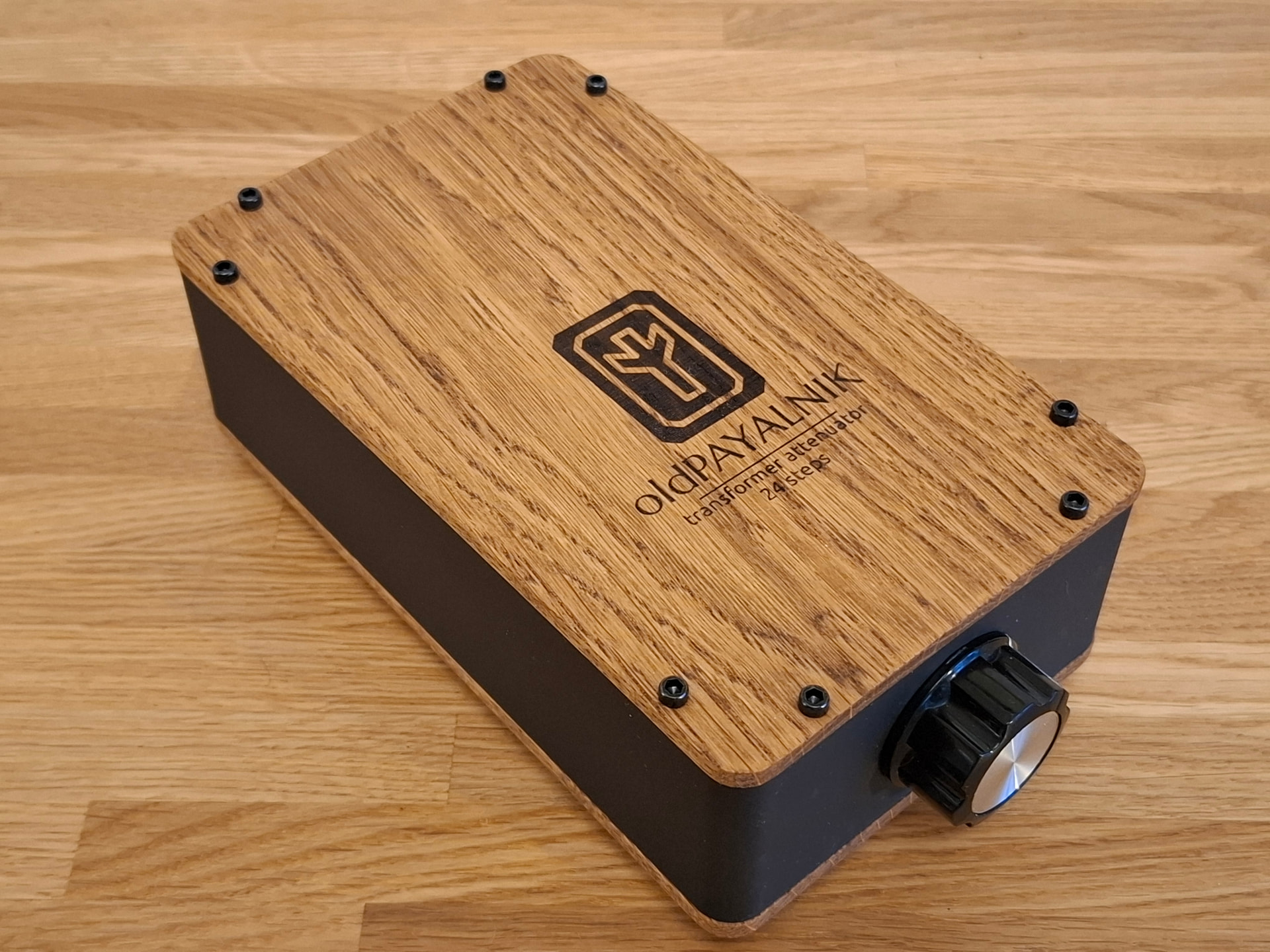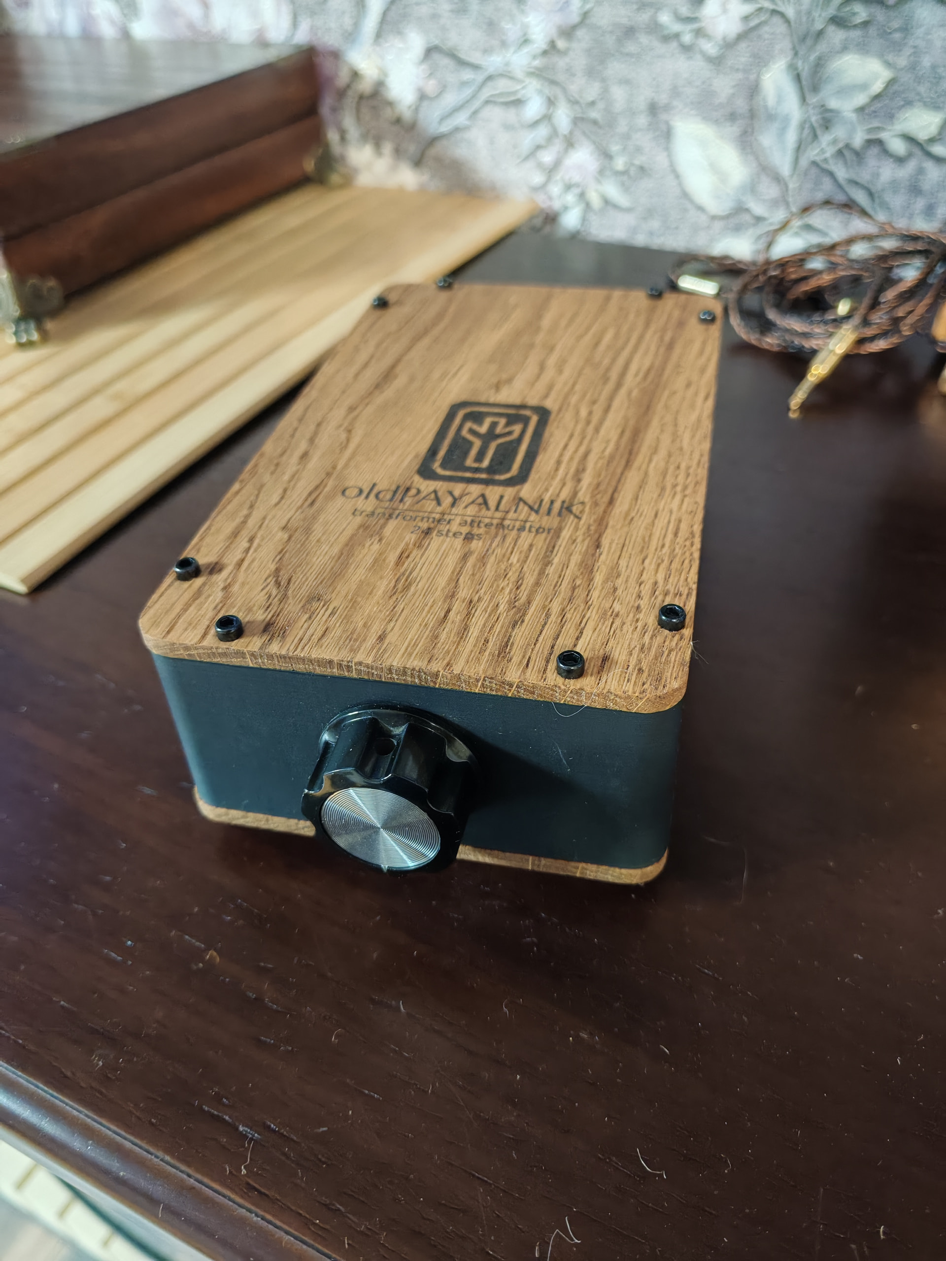 Про крафтовую упаковку подробно рассказали предыдущие участники тура. Повторно на ней не стану заострять внимание. А вот про внешний вид устройства можно говорить бесконечно. Предусилитель выполнен в очень компактном форм-факторе, соразмерном формату А5 бумажного листа. Корпус, как я понимаю, выполнен из твердого пластика тёмно-серого цвета. Верхняя и нижняя поверхности устройства выполнены из тонкого продольного спила твердых пород дерева. Есть подозрение, что древесина была обработана маслом для придания более загорелого внешнего вида и сохранности материала. Верхняя и нижняя деревянные части крепятся к основной части корпуса с помощью винтов, шляпки которых изрядно выпирают над плоскостью верней и нижней поверхностей устройства. При этом, я не могу сказать, что есть риск поцарапаться или зацепиться чем –то за них. За все время работы с устройством, проблем с выпирающими шляпками (и устройством в целом) у меня не возникало.